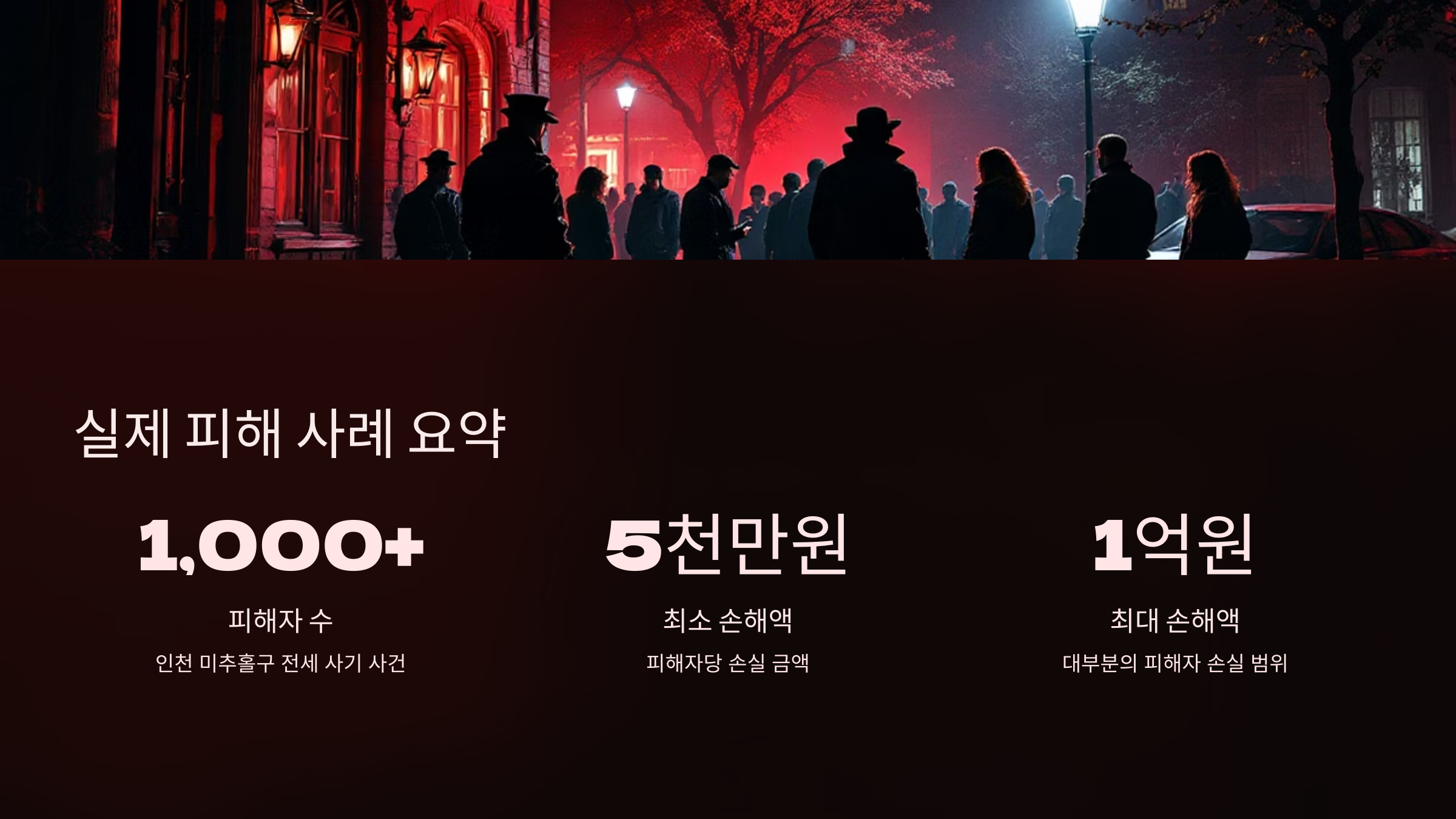 [사례] 인천 미추홀구 전세 사기 사건은 2023~2024년 전국 전세 사기 중 가장 큰 피해를 낳았습니다. 신축 빌라 수십 채에 전세보증금만 받고, 담보 대출까지 받아 잠적한 일당이 벌인 사건이었죠. 피해자는 1,000명이 넘고, 대부분 보증금 5천만 원~1억 원 손해를 봤습니다.