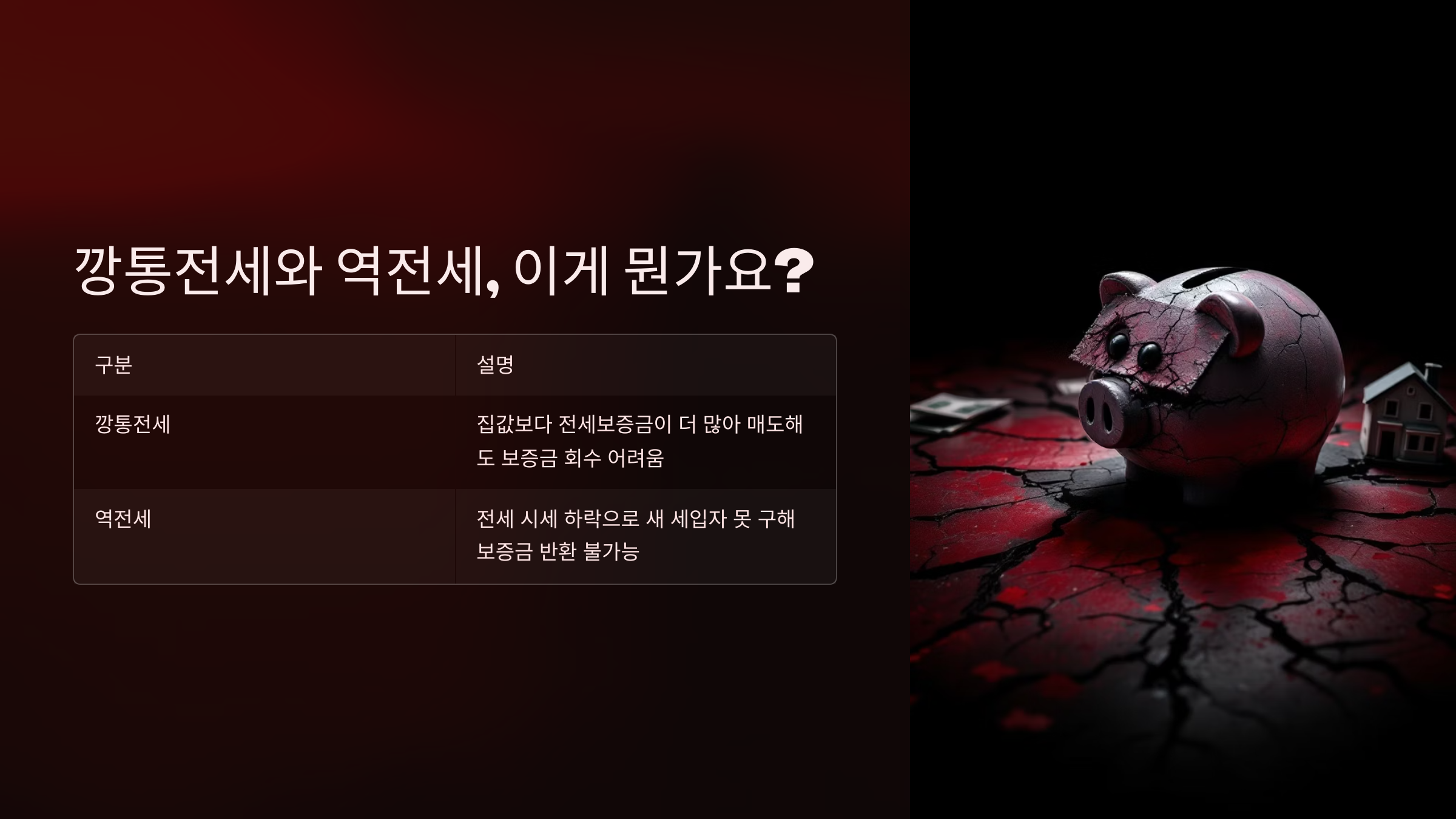 - 깡통전세: 매매가보다 전세금이 더 높아 자산가치보다 부채가 많은 상태