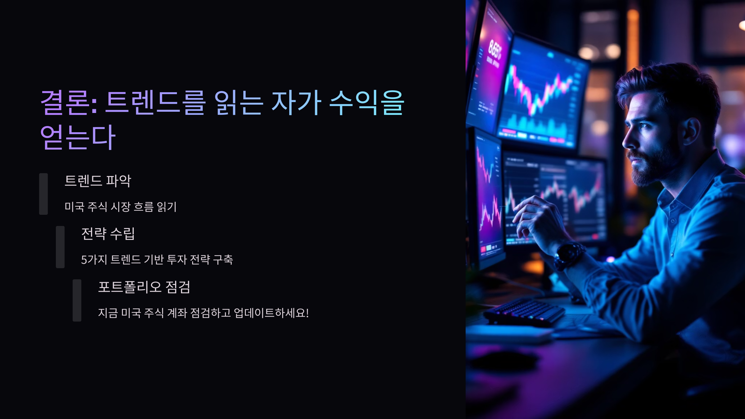 미국 주식 시장은 빠르게 변화하지만, 그 속에서 흐름을 읽고 미리 대응하는 투자자는 꾸준한 수익을 얻습니다. 오늘 소개한 5가지 트렌드를 잘 기억하고, 나만의 투자 전략에 적용해 보세요.