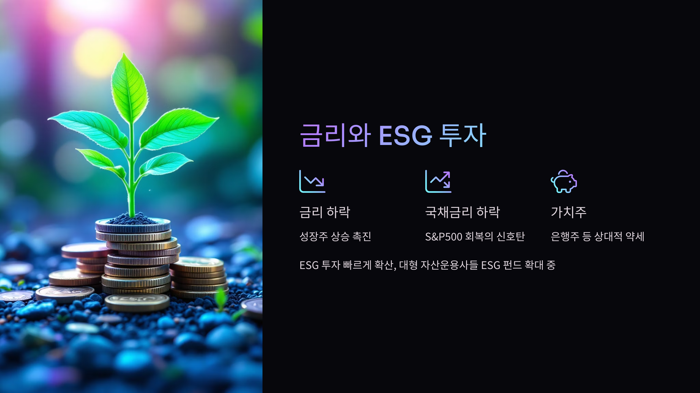기후위기, 기업의 사회적 책임 강화 이슈로 인해 ESG 투자가 빠르게 확산되고 있습니다. 미국 대형 자산운용사들은 ESG 기준을 반영한 펀드를 확대 중이며, 투자자 관심도 증가 중입니다.