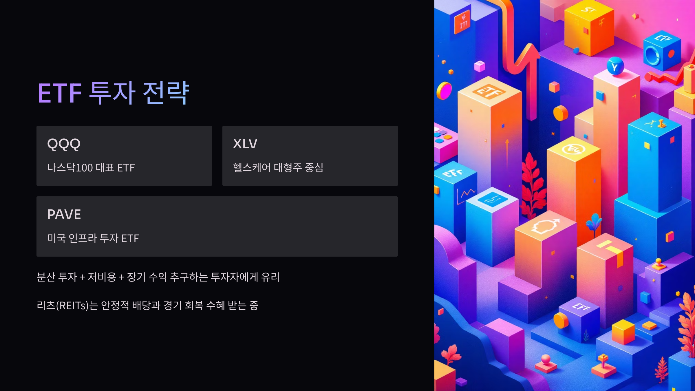 ETF는 분산 투자 + 저비용 + 장기 수익을 추구하는 투자자에게 유리합니다.