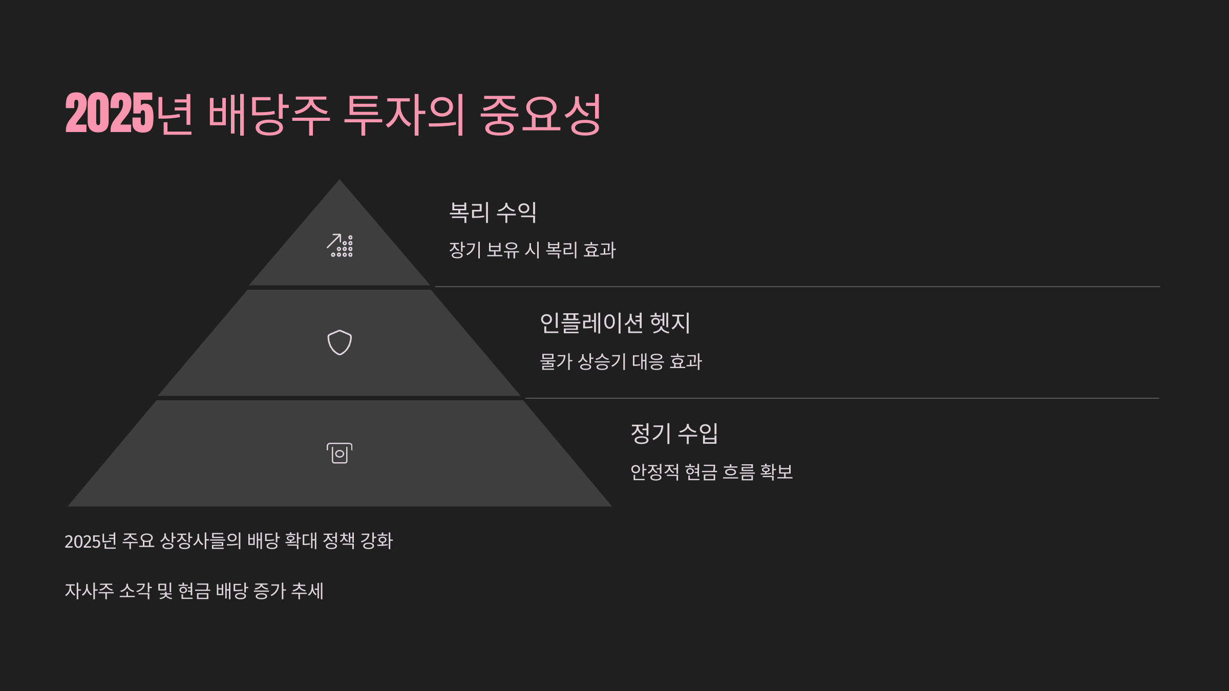 2025년은 주요 상장사들이 배당 확대 정책을 강화하고 있고, 자사주 소각 및 현금 배당을 늘리는 추세입니다. 개인 투자자 입장에서는 안정적인 현금 흐름 확보 기회가 됩니다.