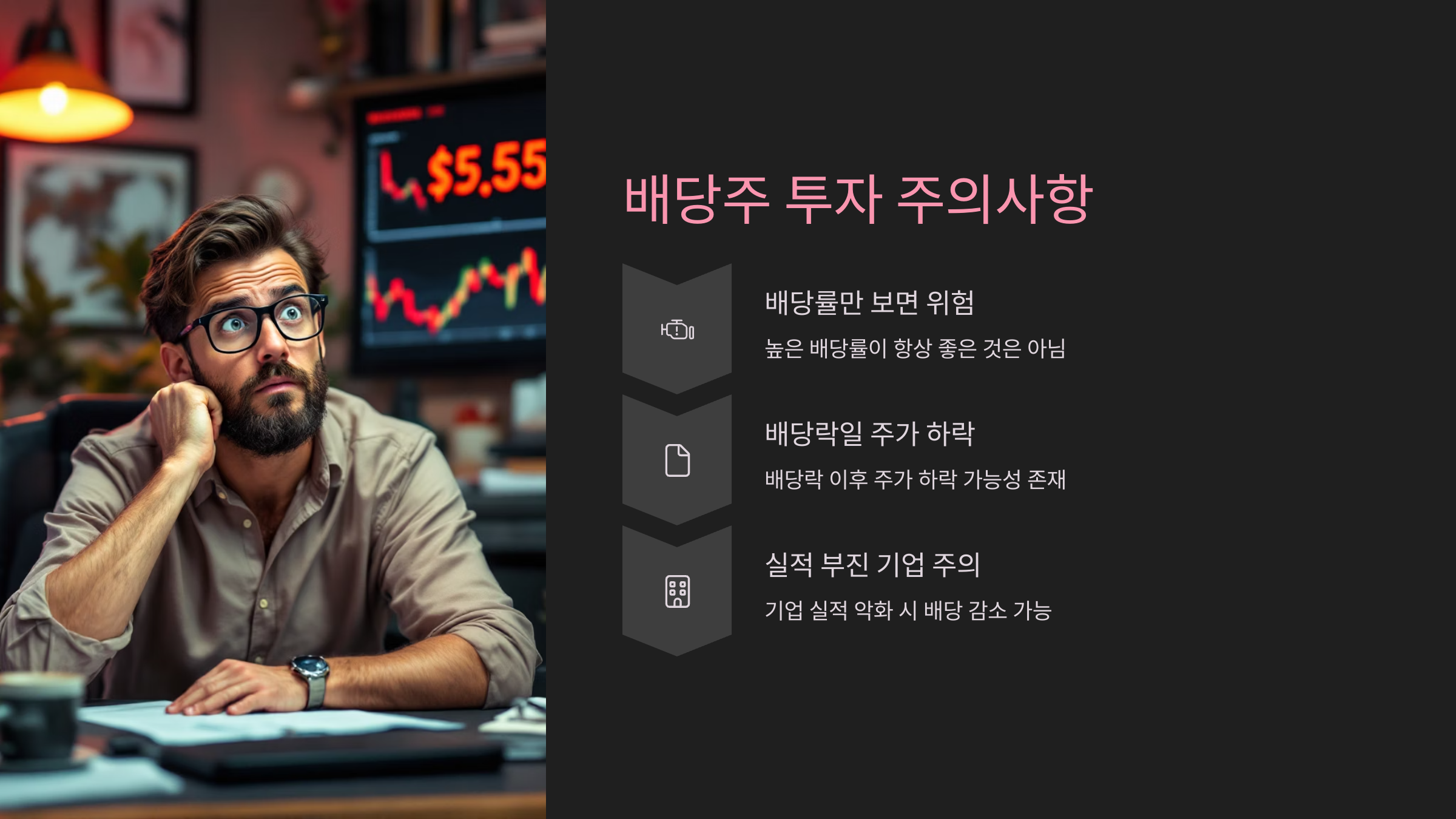 배당률만 보고 투자하면 위험할 수 있습니다. 배당 성향, 기업 실적, 산업 전망을 종합적으로 판단해야 합니다.