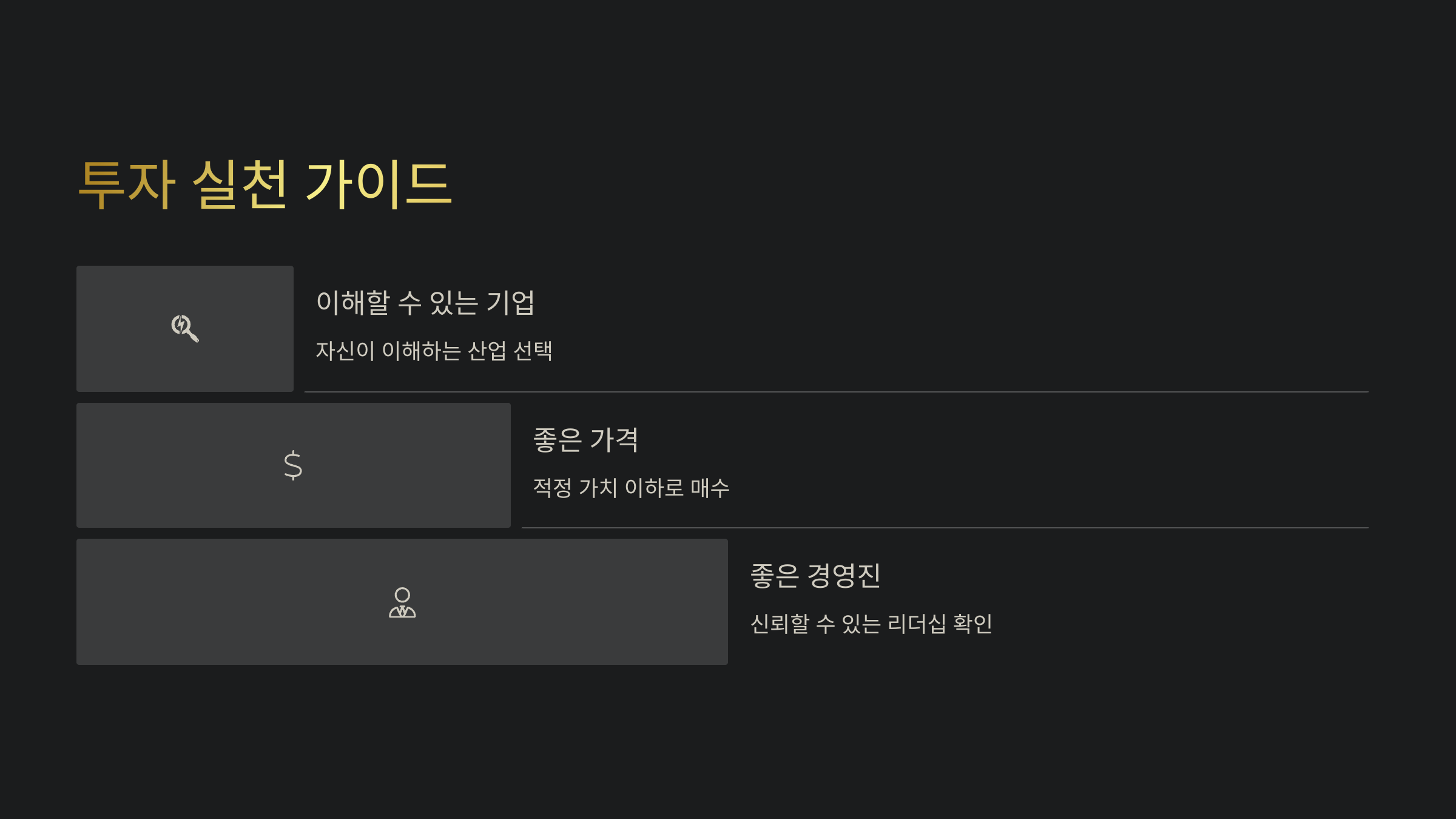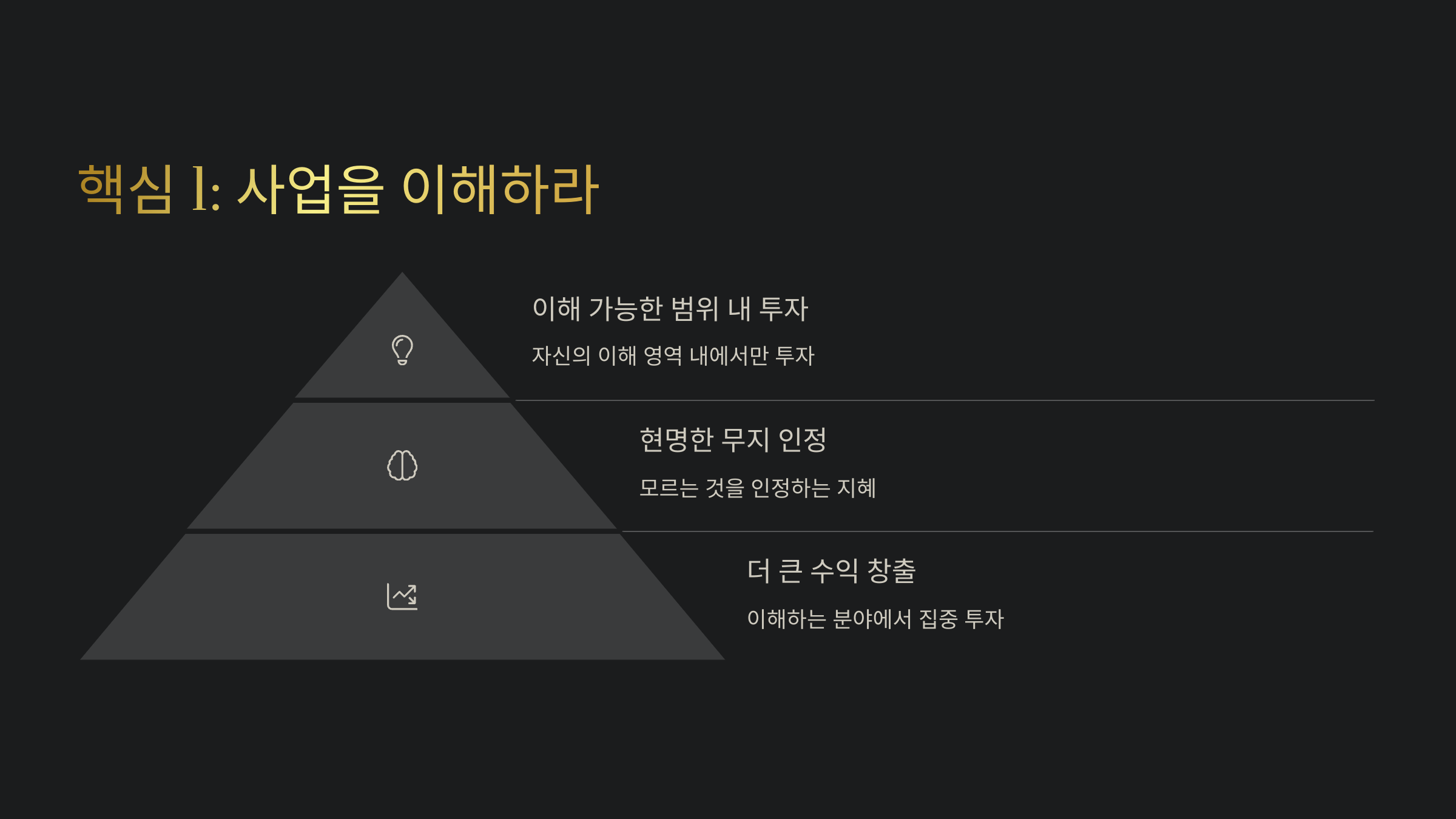 | 1. 사업을 이해하라 | 자신이 이해할 수 있는 범위 내의 산업과 기업에만 투자하라. '현명한 무지'를 인정하는 것이 더 큰 수익을 만든다. |