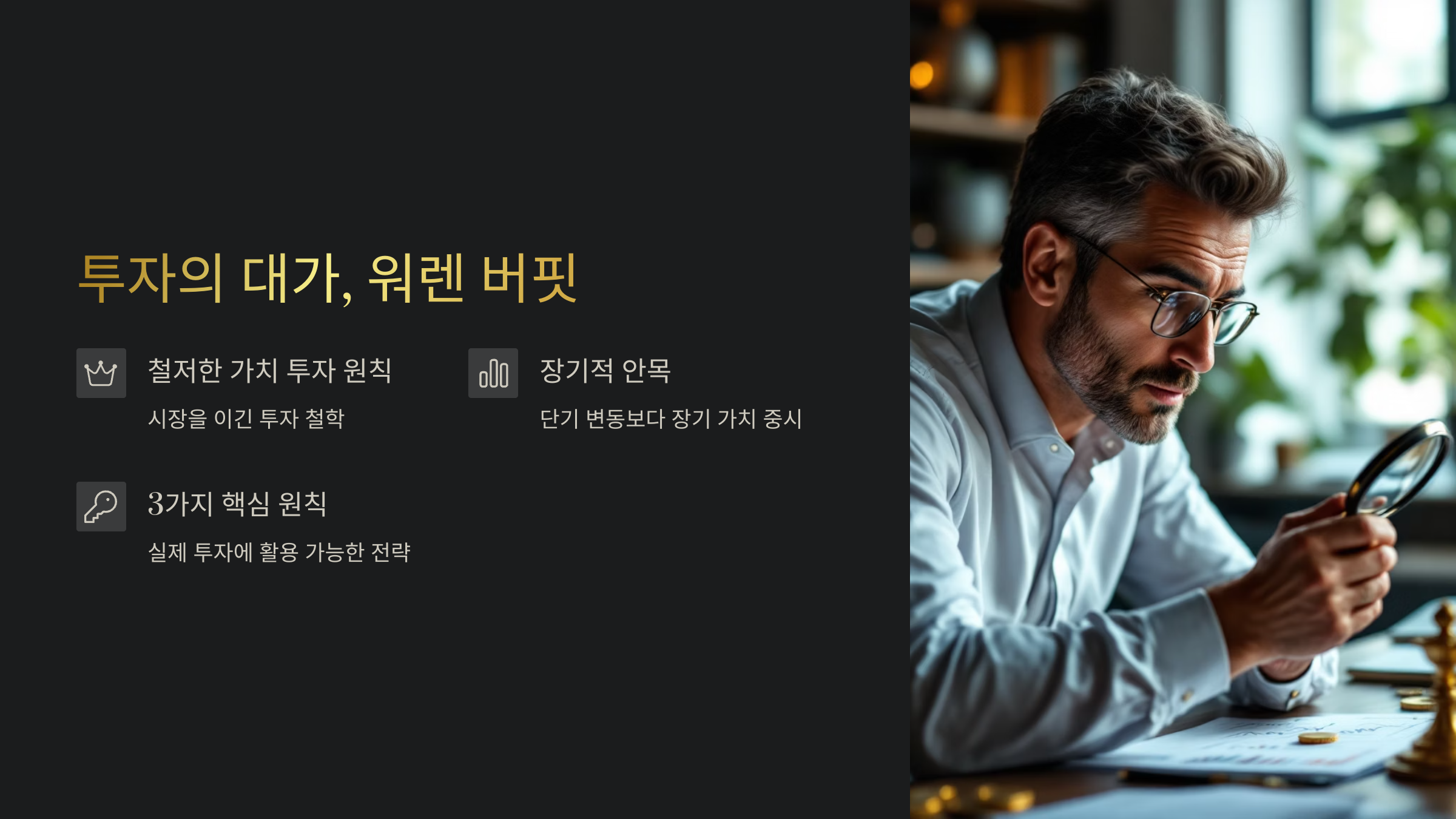 안녕하세요! 수많은 투자자들이 '워런 버핏'이라는 이름 앞에서 고개를 끄덕이죠. 왜일까요? 바로 철저한 가치 투자 원칙을 지키며 장기적인 안목으로 시장을 이긴 인물이기 때문입니다. 오늘은 워런 버핏이 평생 강조해 온 3가지 가치 투자 핵심에 대해 알아보고, 실제 투자에 어떻게 활용할 수 있는지 알려드릴게요.