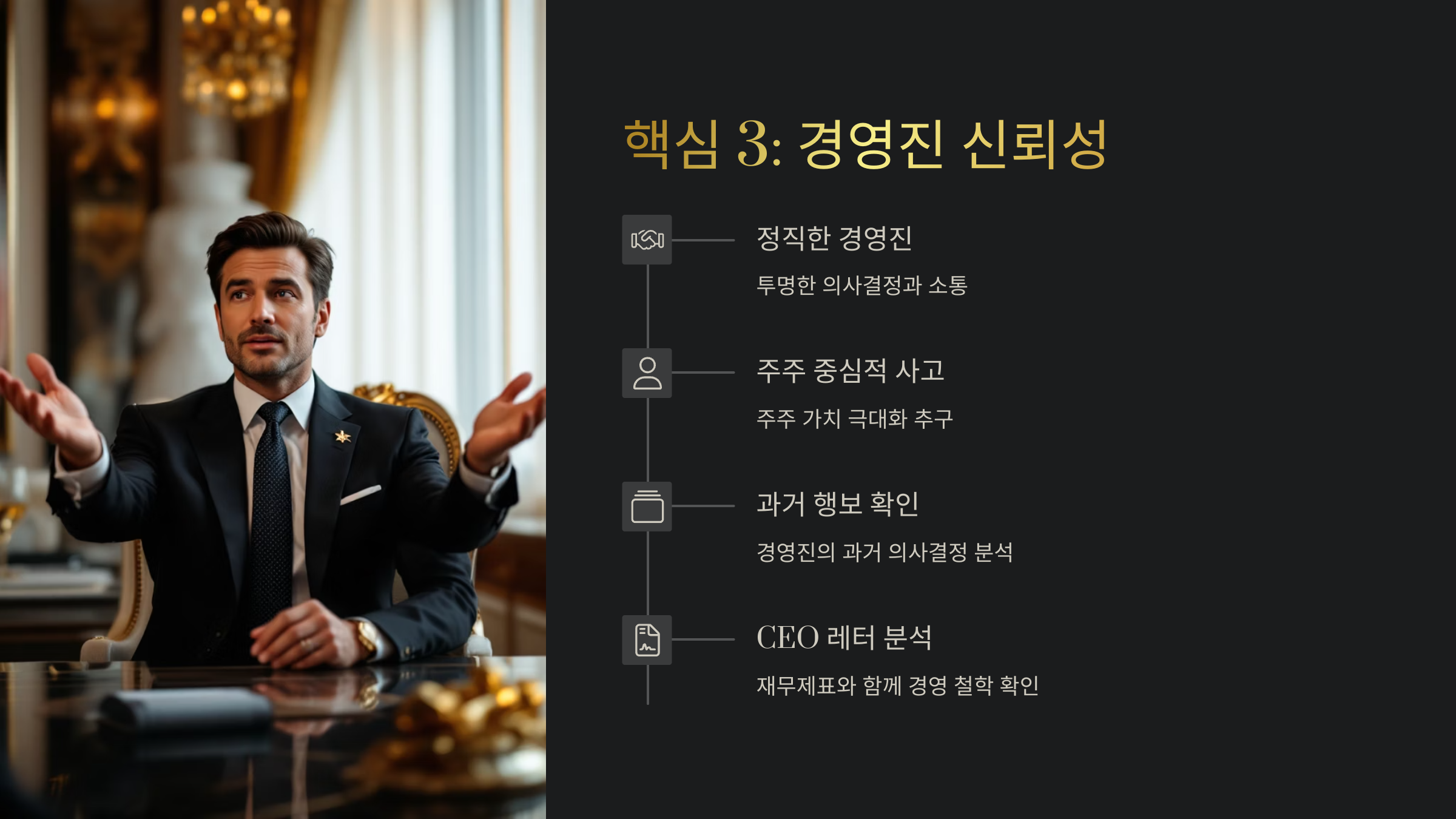 3. 경영진을 믿을 수 있어야 한다 | 정직하고 주주 중심적인 사고를 가진 경영진이 있는가? 그들의 과거 행보를 통해 확인하라. |