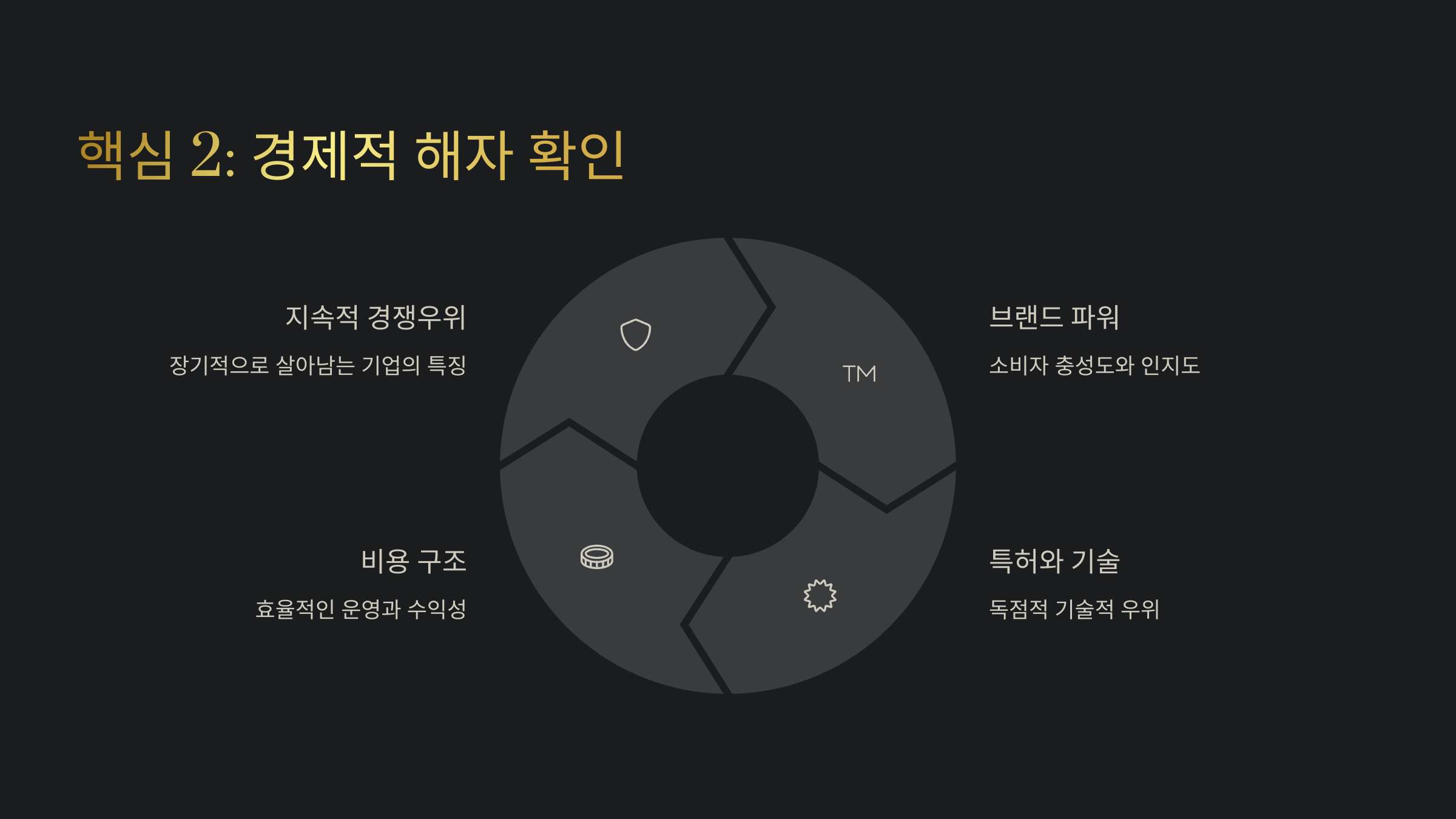 | 2. 경제적 해자를 확인하라 | 지속적인 경쟁우위(Moat)가 있는 기업만이 장기적으로 살아남는다. 브랜드, 특허, 비용 구조 등 장벽을 분석하라. |