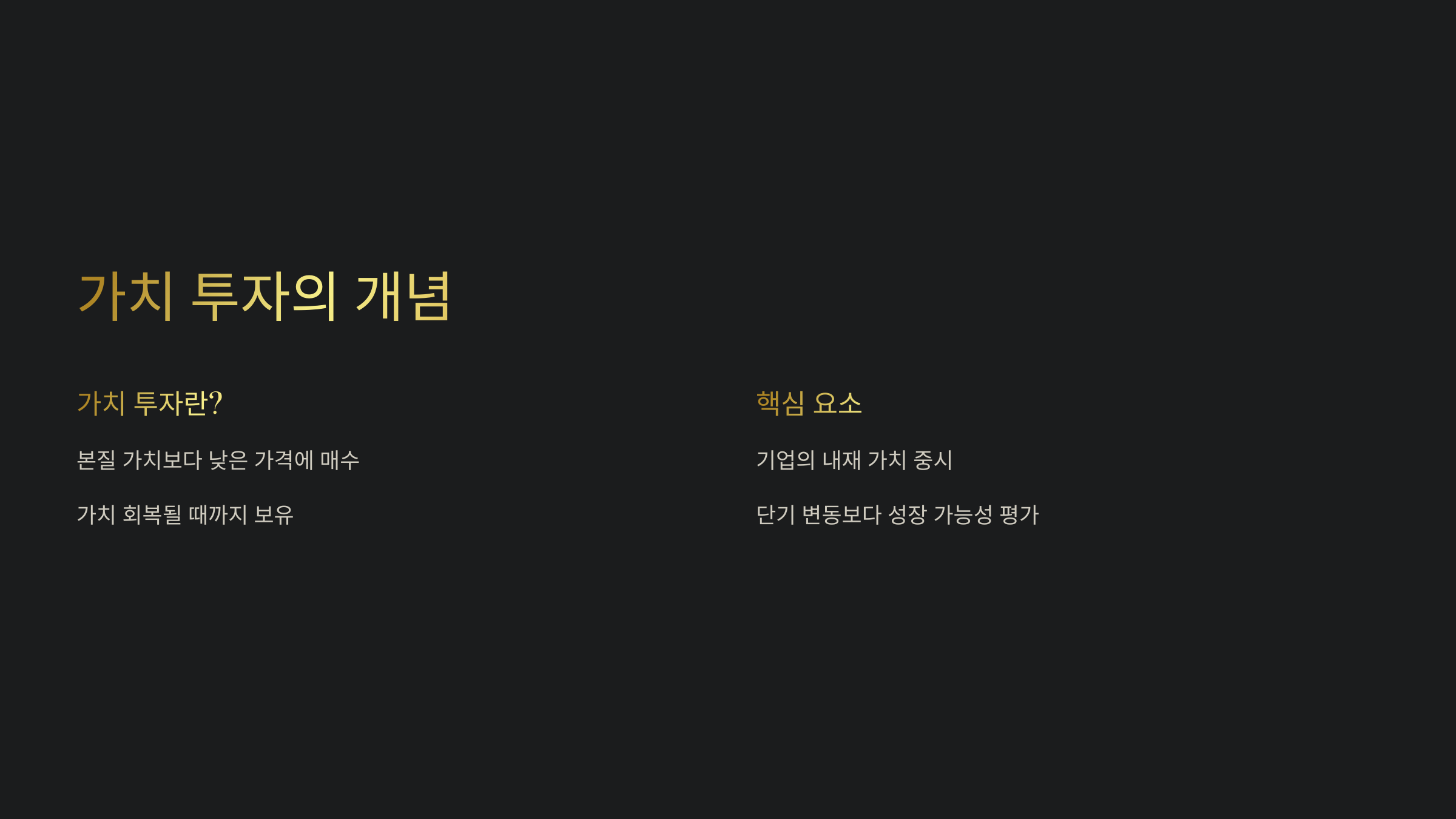 가치 투자는 주식이나 자산의 '본질 가치'보다 낮은 가격에 거래될 때 매수하고, 그 가치가 회복될 때까지 보유하는 투자 전략입니다. 단기적인 가격 변동보다는 기업의 내재 가치와 성장 가능성을 중시합니다.