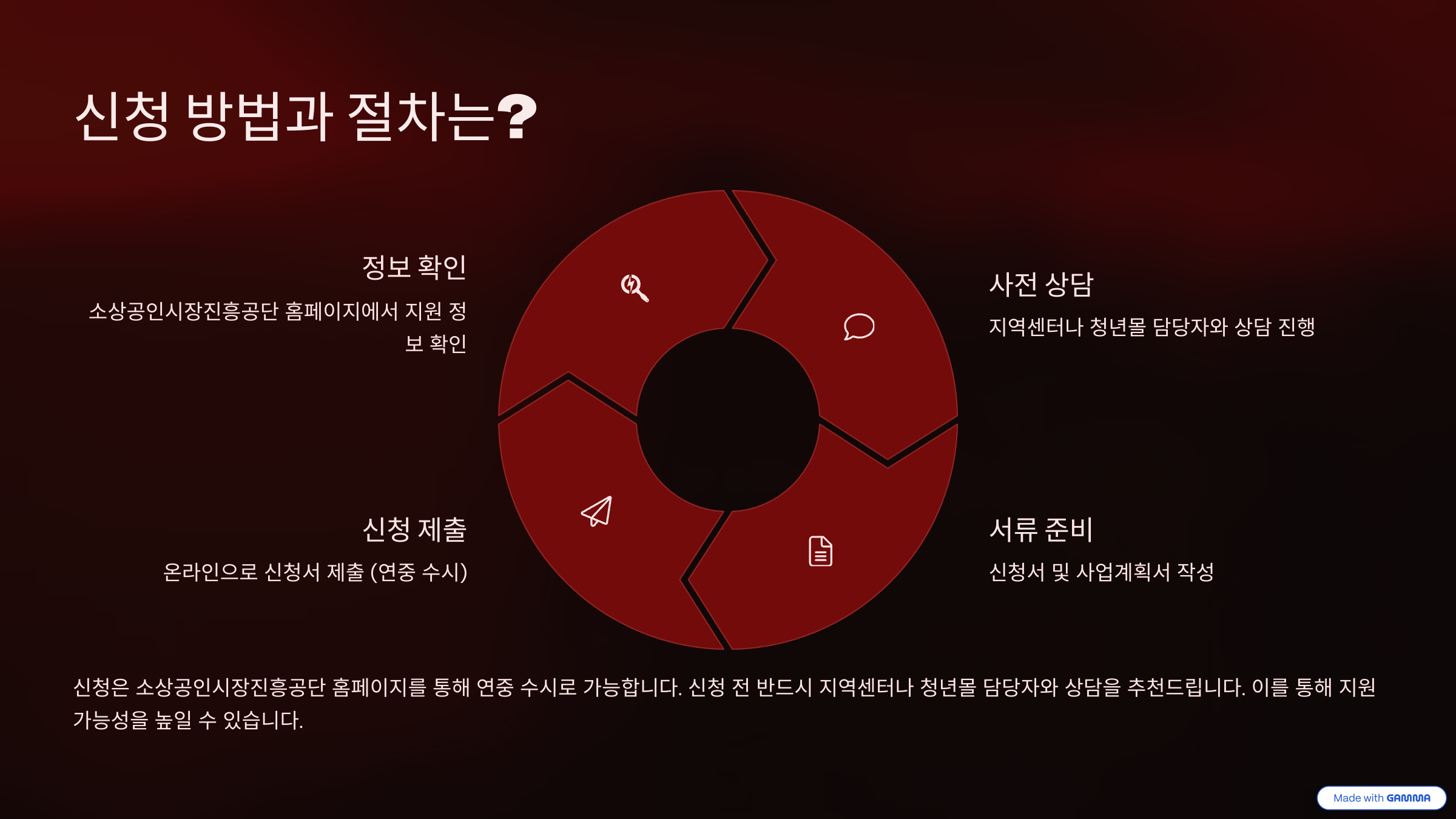 신청은 소상공인시장진흥공단 홈페이지를 통해 연중 수시로 가능합니다. 신청 전 반드시 지역센터나 청년몰 담당자와 상담을 추천드립니다.