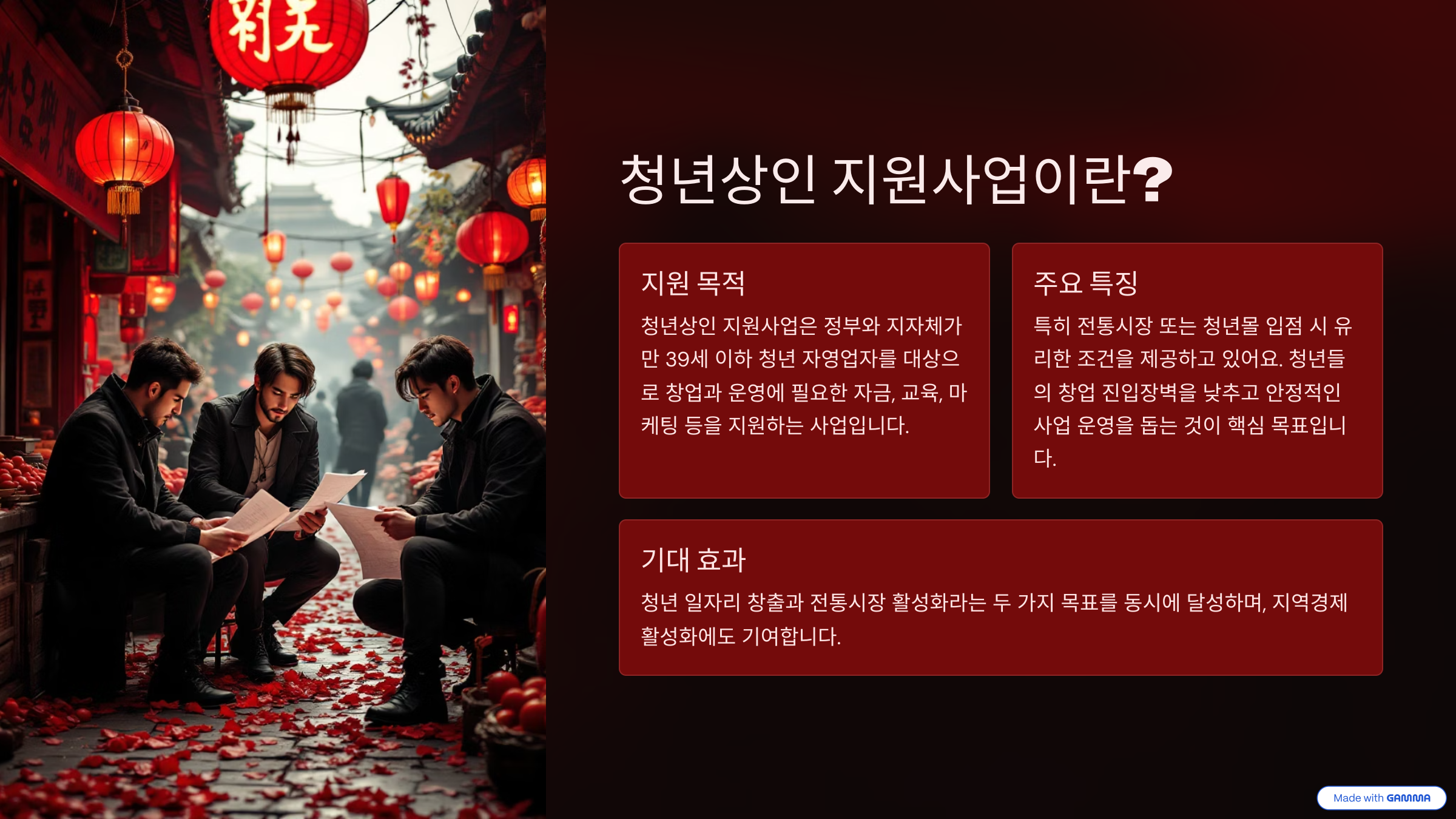청년상인 지원사업은 정부와 지자체가 만 39세 이하 청년 자영업자를 대상으로 창업과 운영에 필요한 자금, 교육, 마케팅 등을 지원하는 사업입니다. 특히 전통시장 또는 청년몰 입점 시 유리한 조건을 제공하고 있어요.