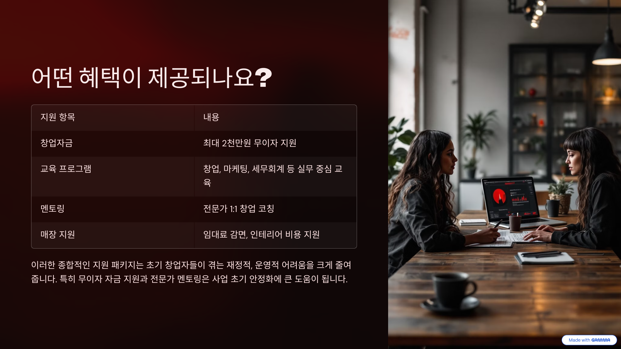 | 매장 지원 | 임대료 감면, 인테리어 비용 지원 |