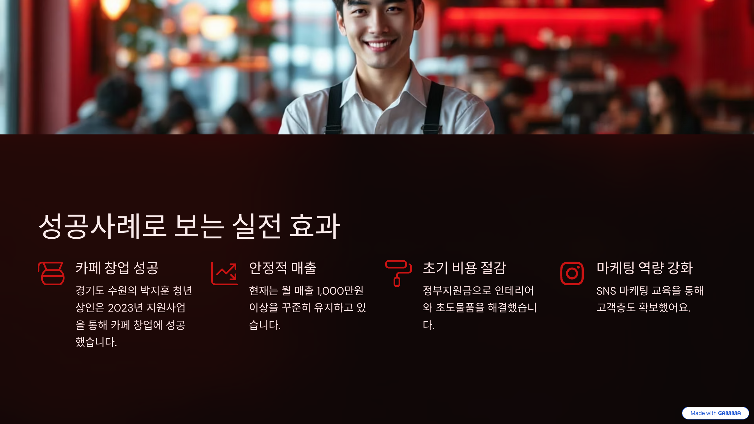경기도 수원의 박지훈 청년상인은 2023년 지원사업을 통해 카페 창업에 성공했고, 현재는 월 매출 1,000만 원 이상을 꾸준히 유지하고 있습니다. 정부지원금으로 인테리어와 초도물품을 해결했고, SNS 마케팅 교육을 통해 고객층도 확보했어요.