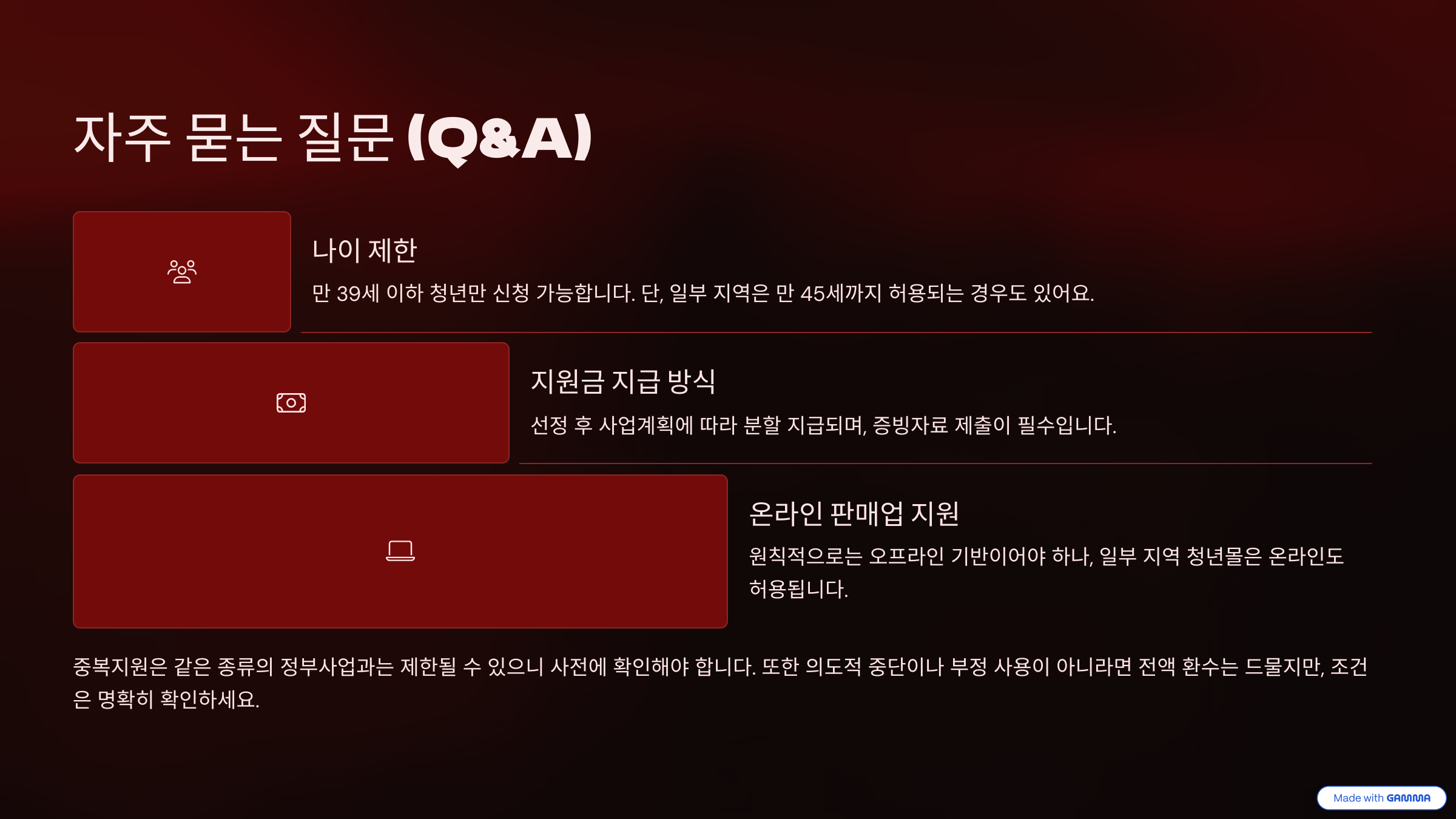A. 같은 종류의 정부사업과는 중복이 제한될 수 있으니 사전에 확인해야 합니다.