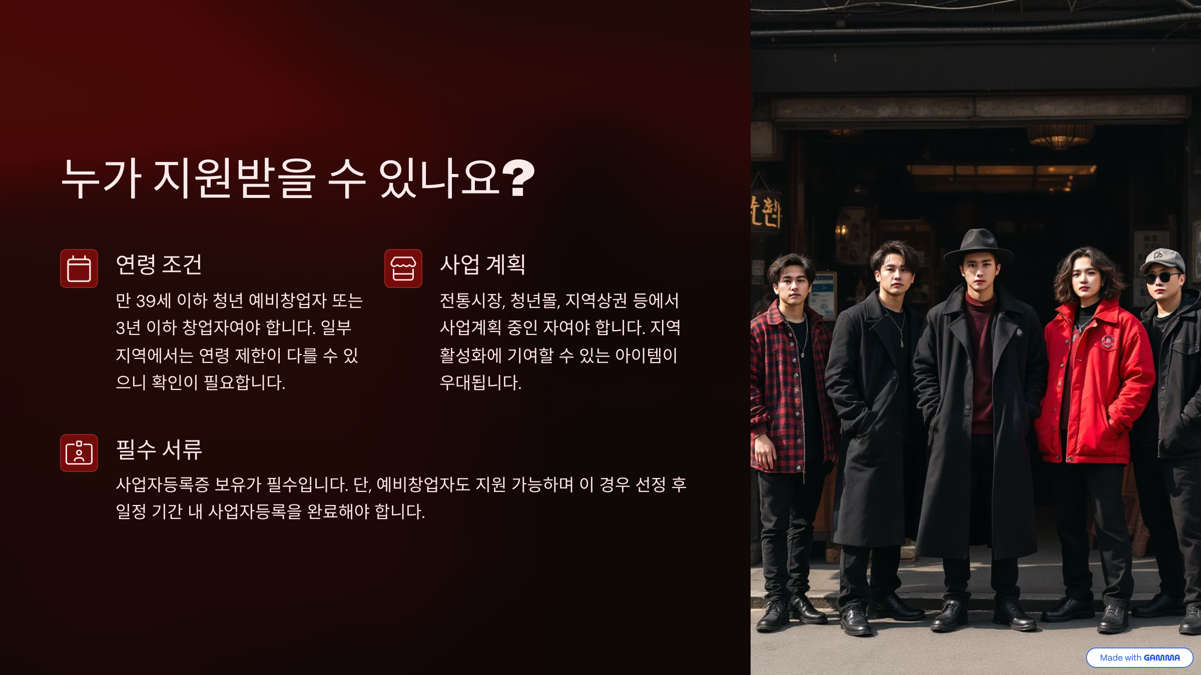 - 만 39세 이하 청년 예비창업자 또는 3년 이하 창업자