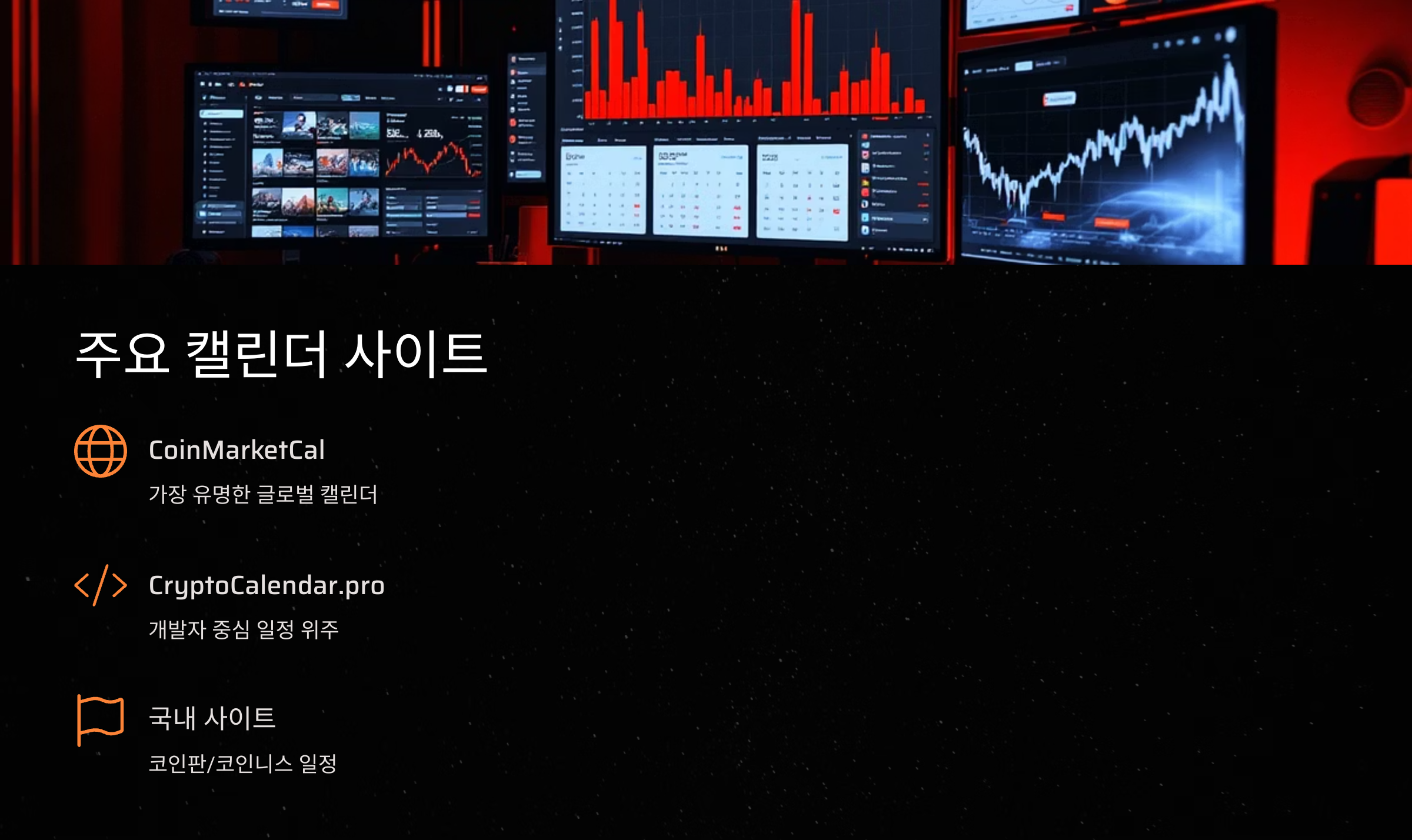 코인 캘린더는 각 프로젝트의 기술 업데이트, 메인넷, 상장, 파트너십 발표 등 일정을 모아둔 일정표입니다. 주요 일정은 가격에 큰 영향을 미칠 수 있으므로, 고수들은 캘린더부터 확인합니다.
