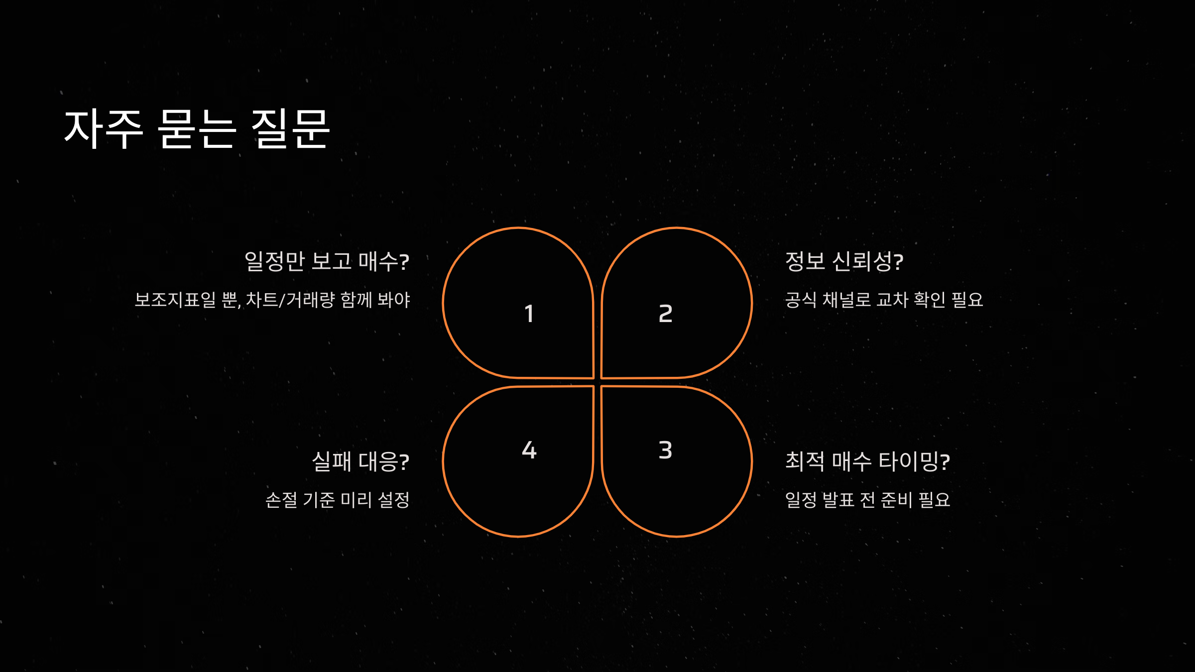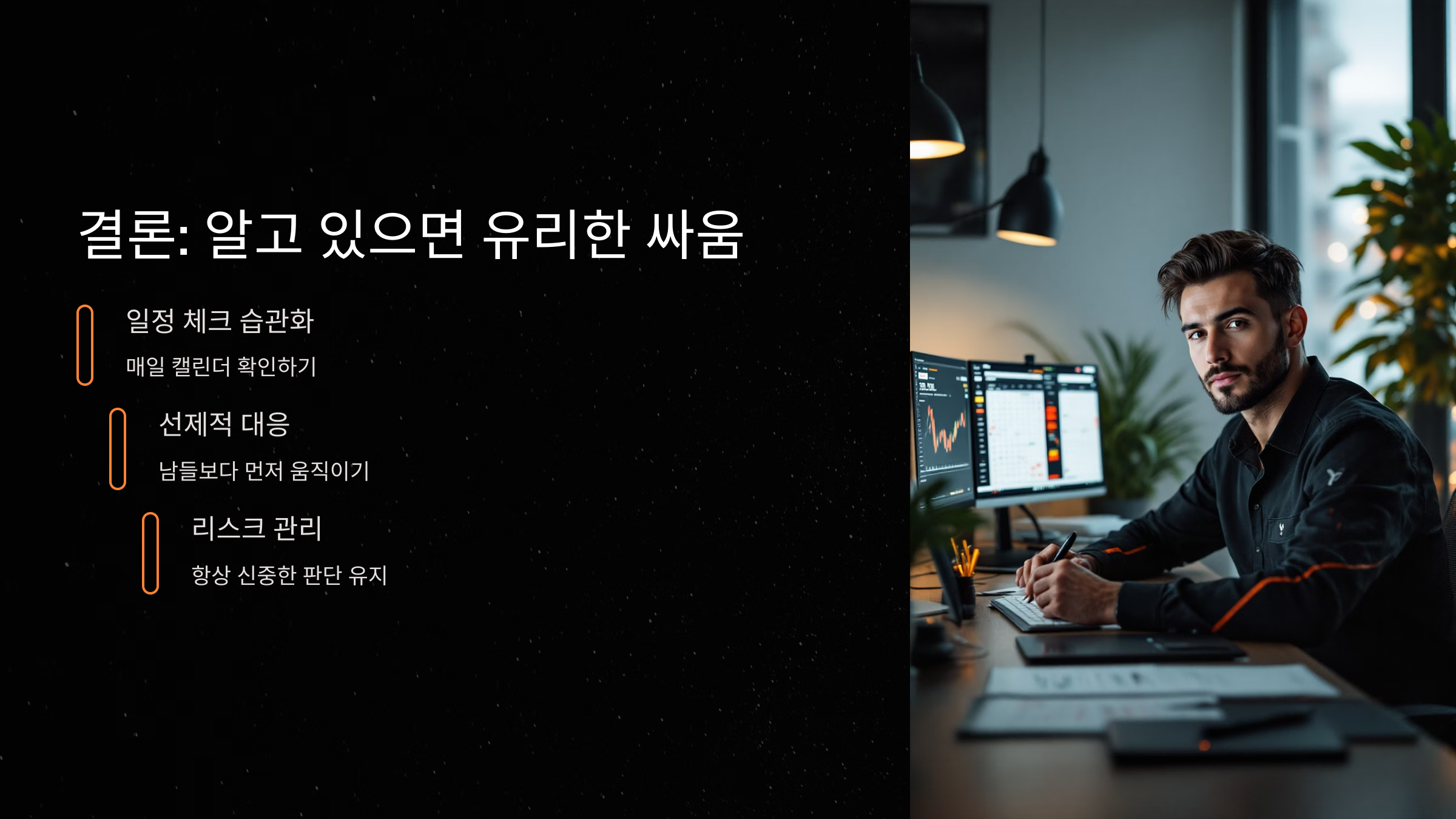 고수들은 단기 호재 캘린더를 보고 미리 준비합니다. 지금부터라도 일정 체크 습관을 들이면, 남들보다 먼저 움직일 수 있습니다. 단, 언제나 리스크 관리와 신중한 판단은 함께 해야겠죠!