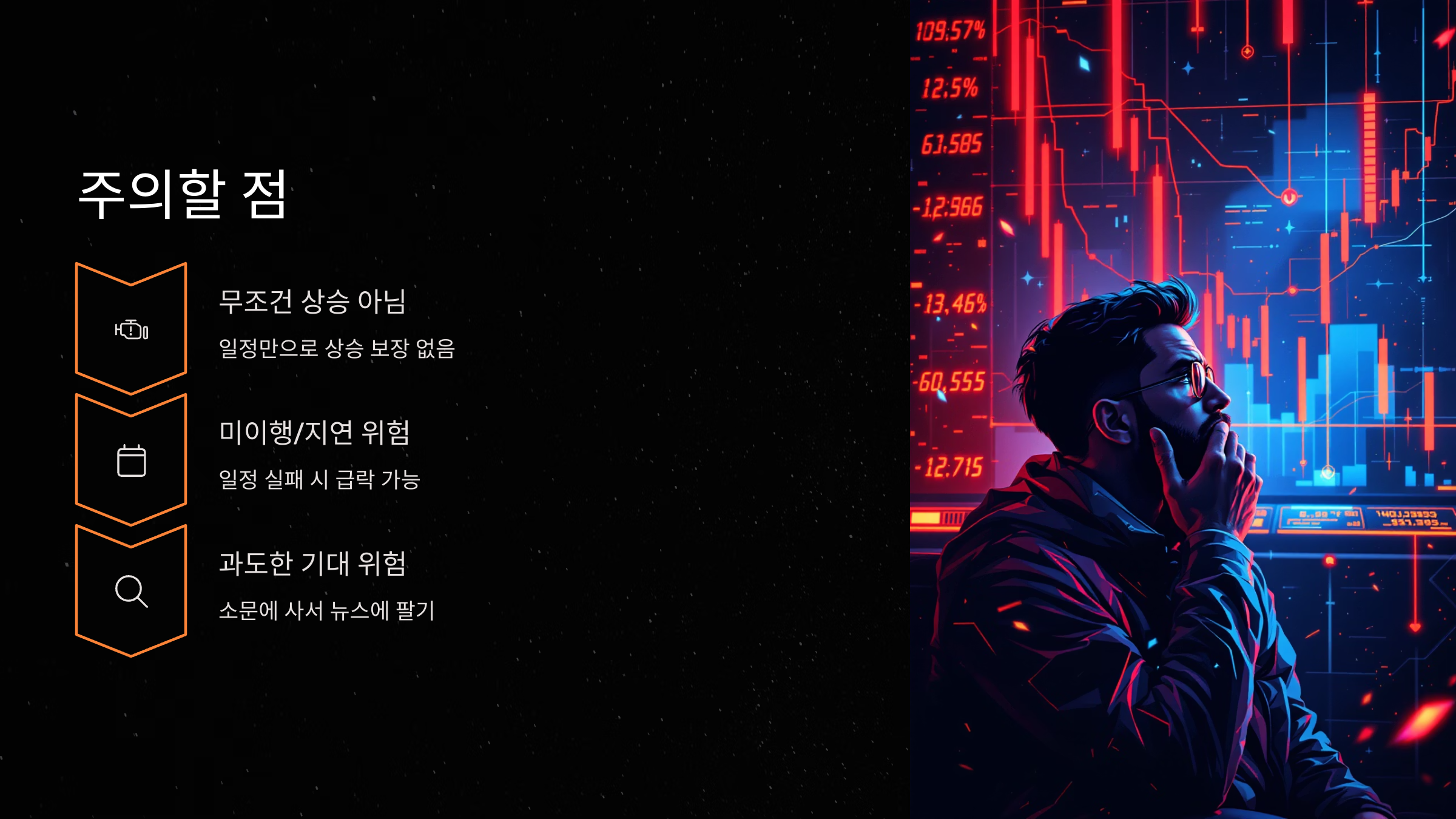 ✔️ 너무 많은 기대는 실망 매물로 이어짐 (소문에 사서 뉴스에 판다)