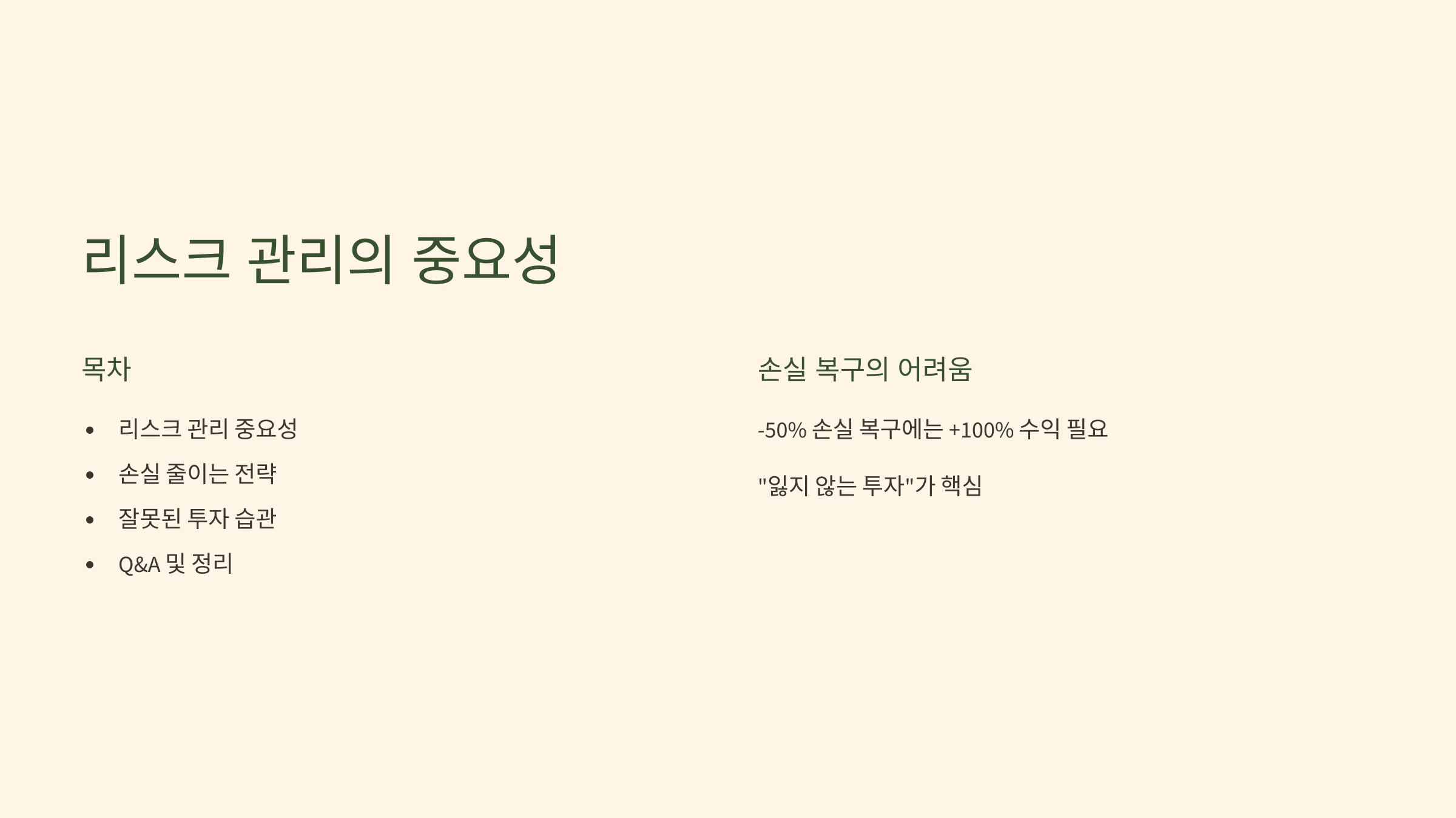 ✅ 수익은 쌓이지만, 손실은 복구가 어렵습니다.