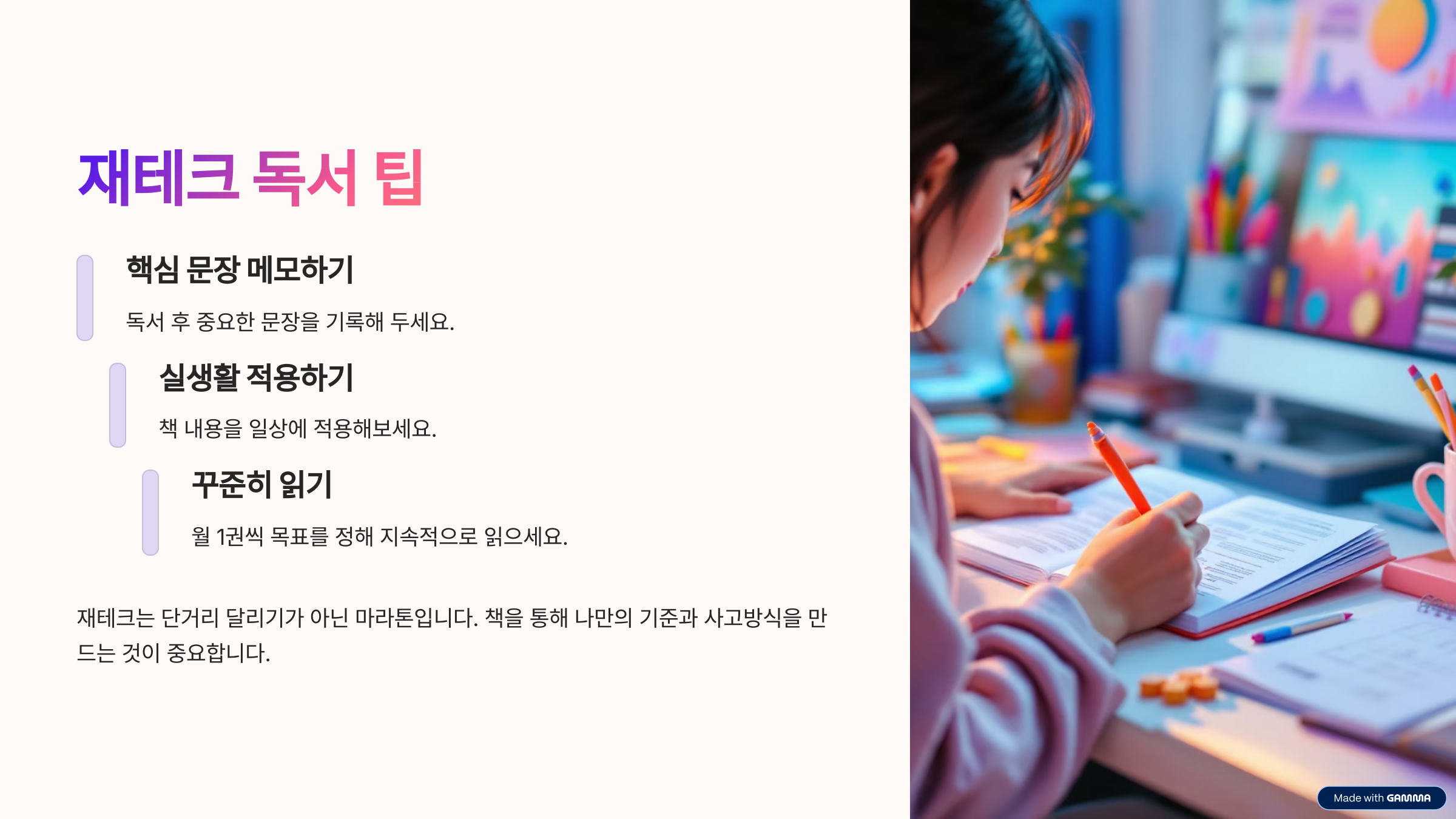 단순히 책을 읽는 것으로 끝내지 말고 자신만의 노트에 정리하거나, 블로그에 서평을 남기며 실천하는 것이 중요합니다. 아래 팁들을 참고해보세요!