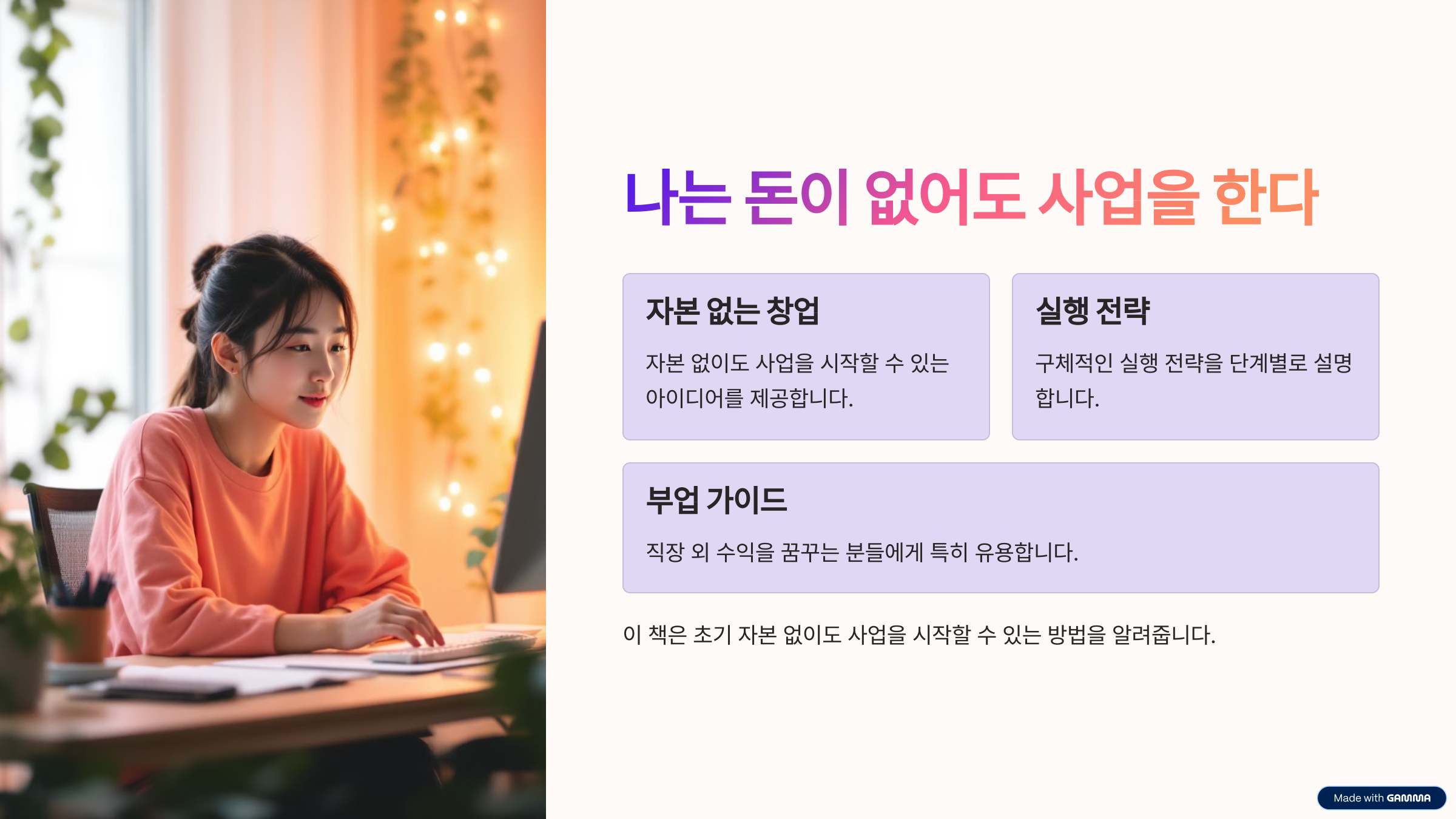 이 책은 자본 없이도 사업을 시작할 수 있는 아이디어와 실행 전략을 알려주는 책입니다. 특히 직장 외 수익을 꿈꾸는 분들에게 추천드려요.