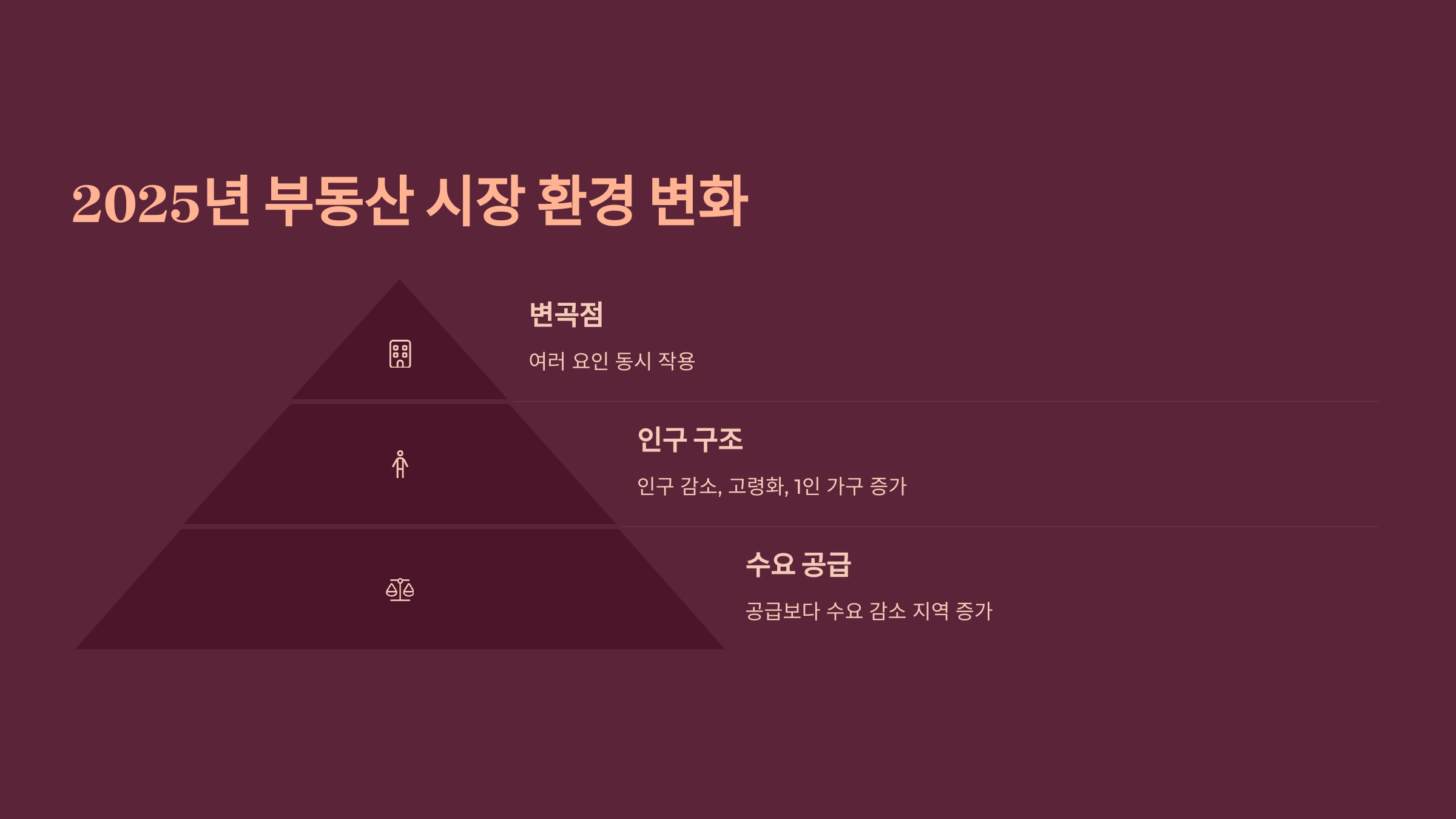 2025년은 부동산 시장의 ‘변곡점’이라 불릴 만큼 여러 요인이 동시에 작용하는 시기입니다. 인구 감소, 고령화, 1인 가구 증가 등 구조적 변화가 본격화되고 있고, 공급보다 수요가 줄어드는 지역이 늘어나고 있습니다.