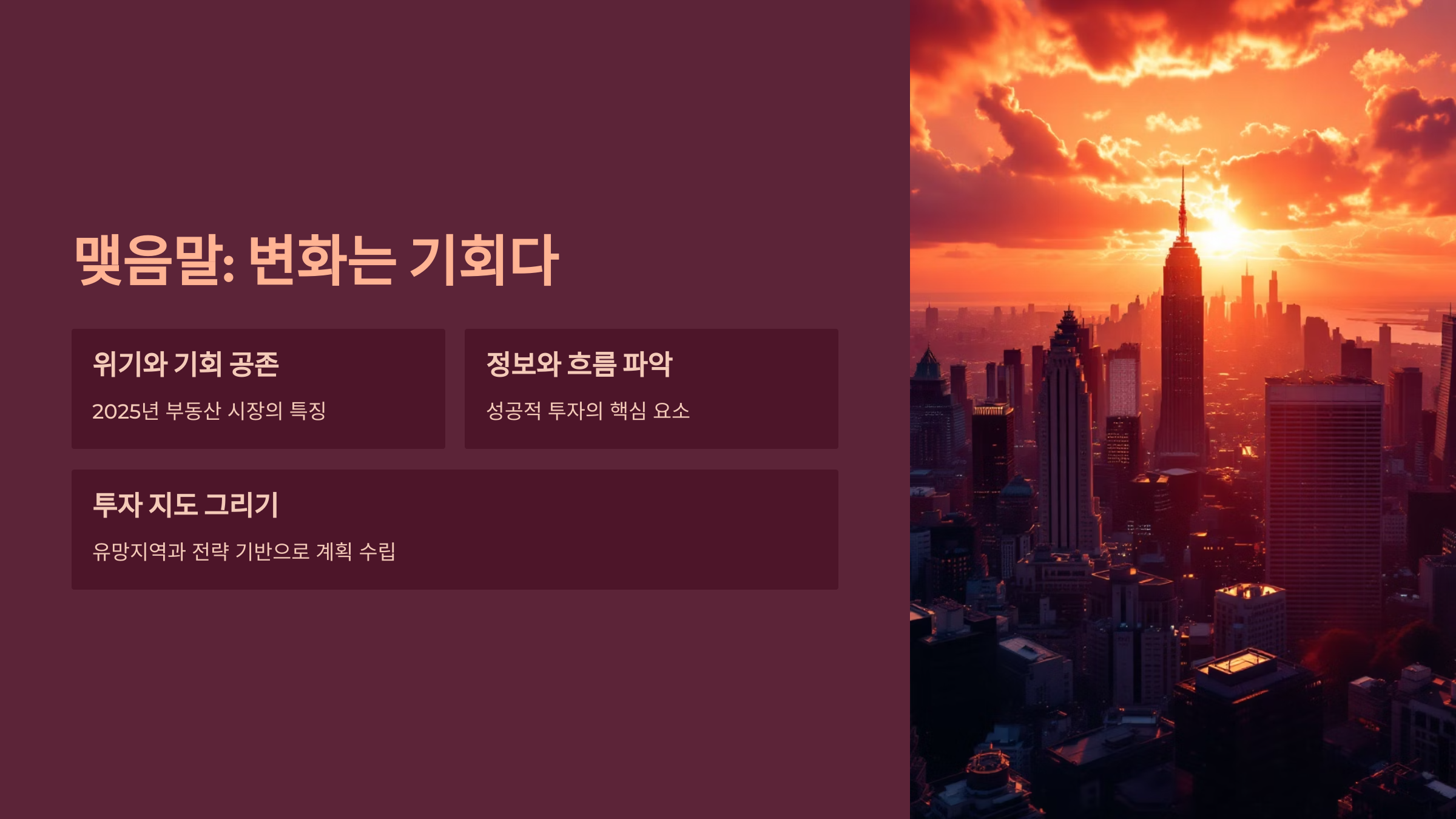 2025년 부동산 시장은 위기와 기회가 공존하는 시기입니다. 정보를 제대로 알고, 흐름을 파악해 준비하는 자만이 성공적인 투자를 할 수 있죠. 오늘 알려드린 유망지역과 전략을 토대로, 여러분만의 투자 지도를 그려보시기 바랍니다.