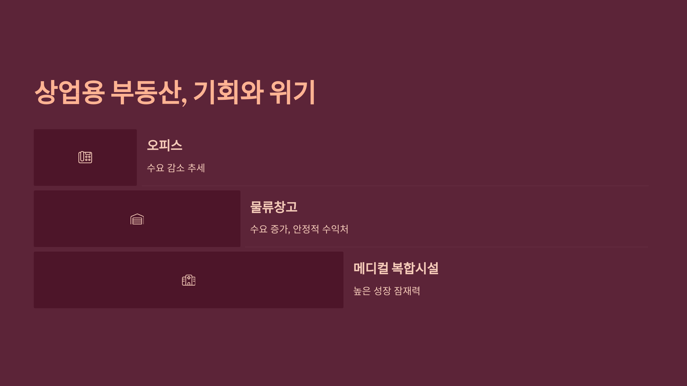 오피스 수요는 줄고 있지만, 물류창고와 데이터센터, 메디컬 복합시설은 오히려 수요 증가세입니다. 특히 수도권 외곽 물류단지는 안정적 수익처로 각광받고 있습니다.