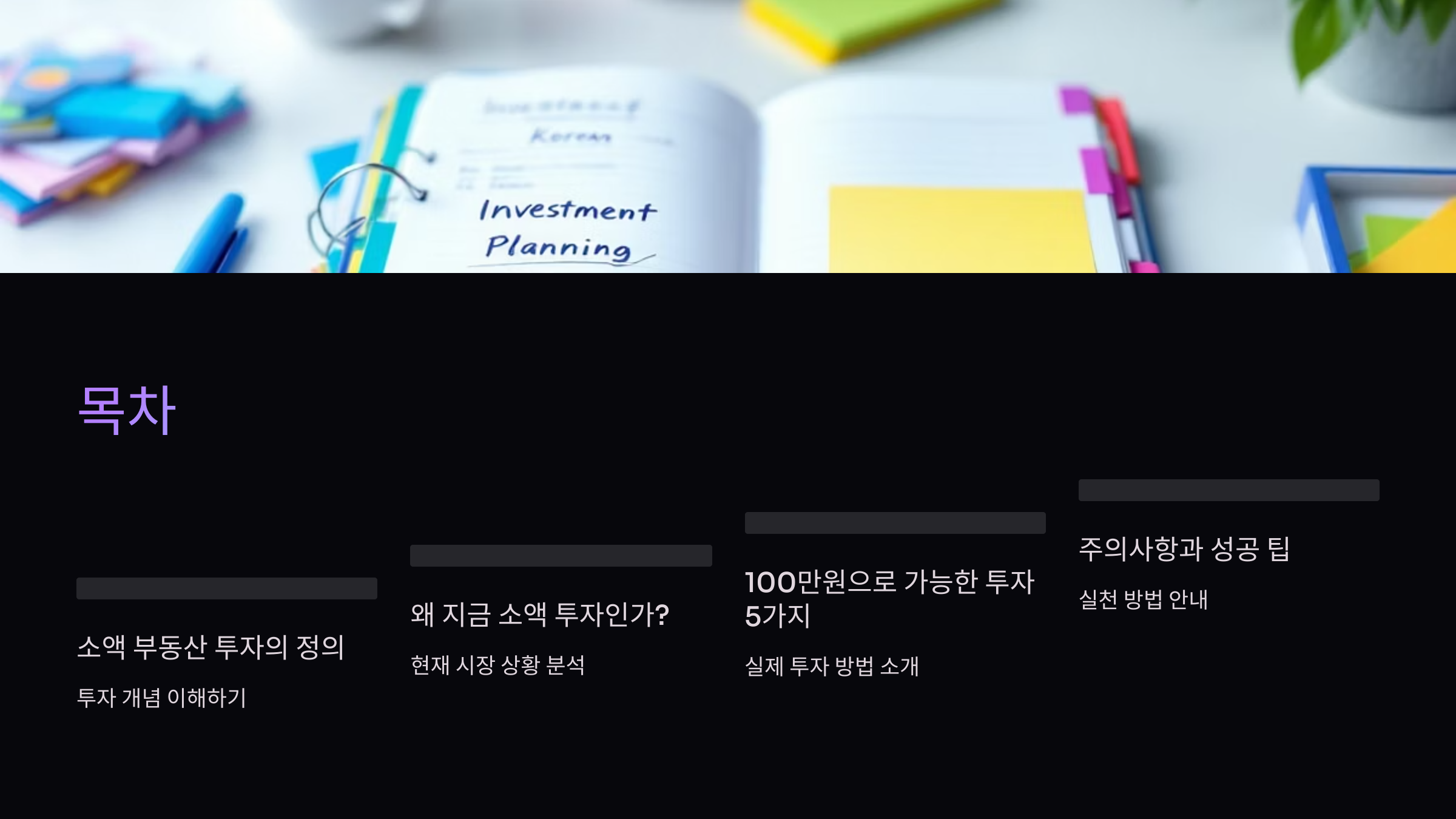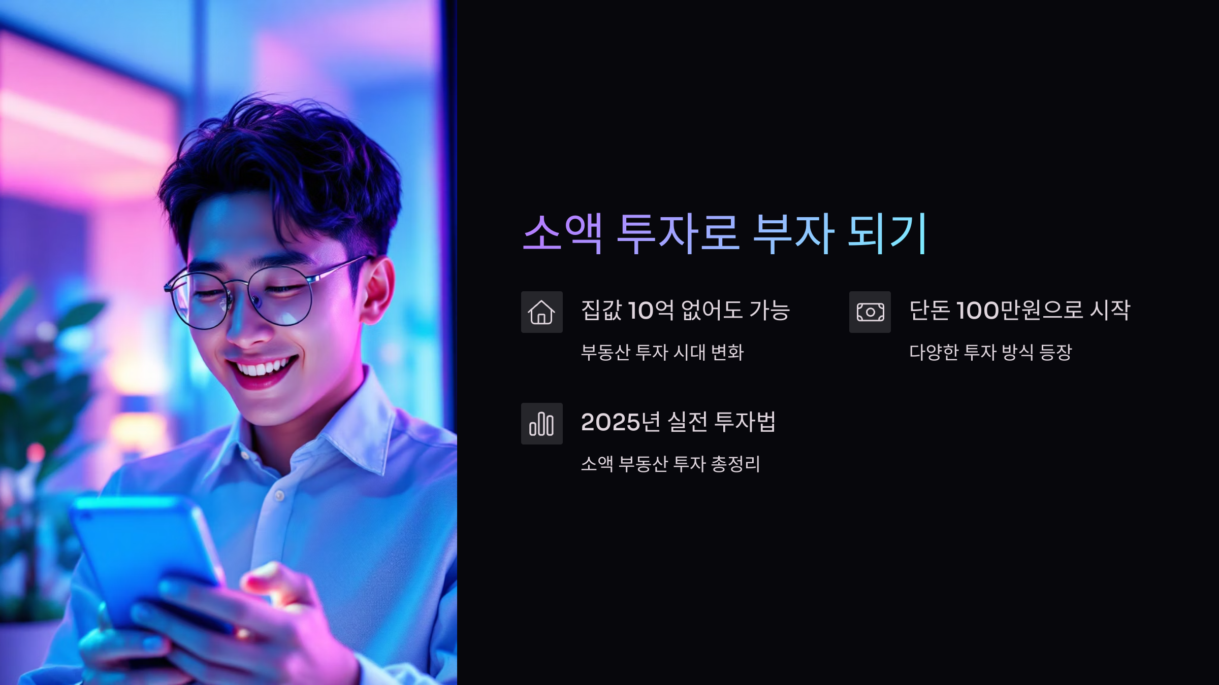 100만 원으로 시작하는 부동산 투자, 이제는 꿈이 아닙니다. 2025년은 소액 투자자에게 더 많은 기회를 주는 시대입니다. 지금이 바로 당신의 첫 부동산을 갖는 출발선!