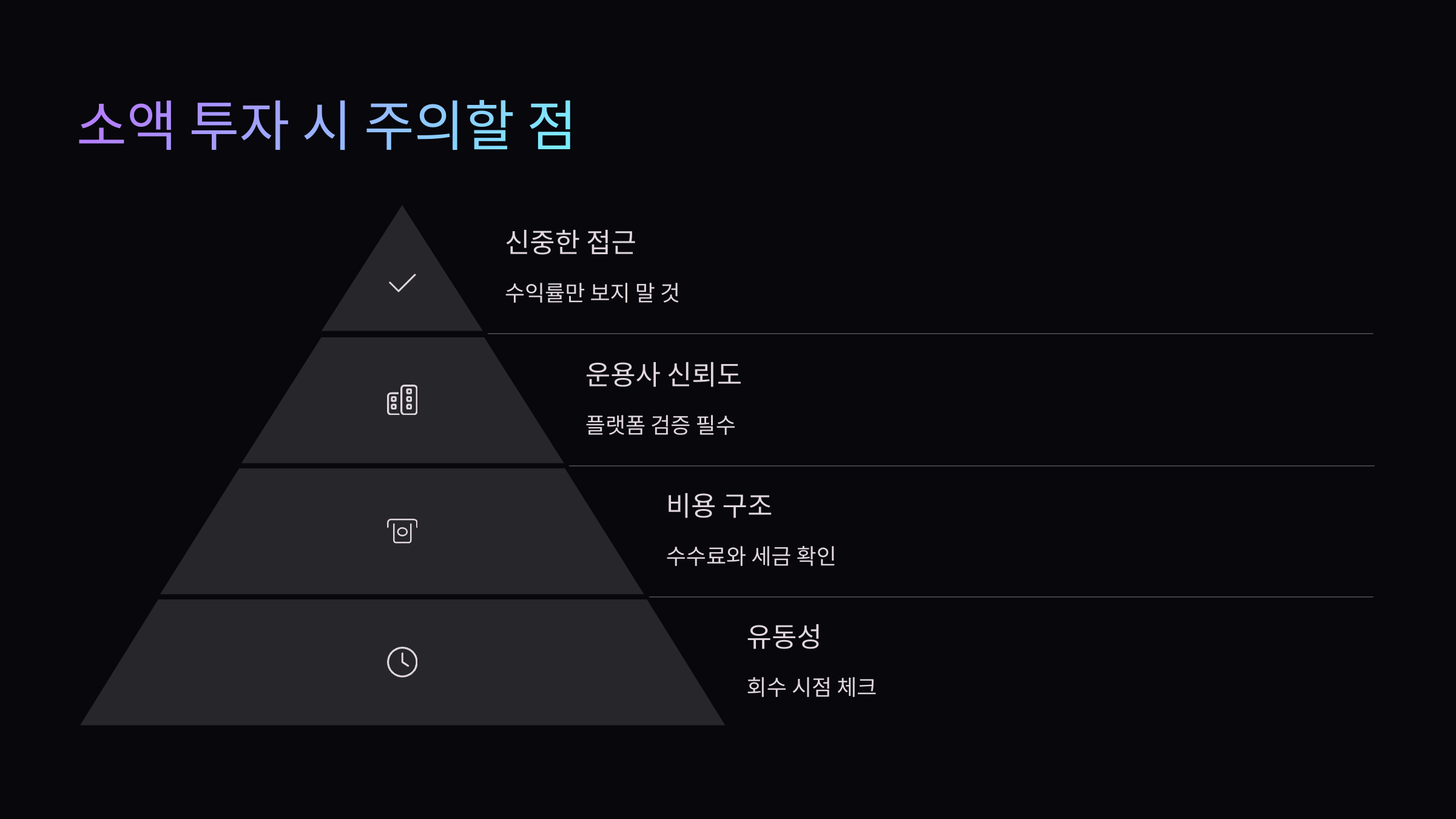 적은 돈이지만 더욱 신중하게 접근해야 합니다. 수익률만 보고 접근하기보다는 다음 사항을 꼭 확인하세요: