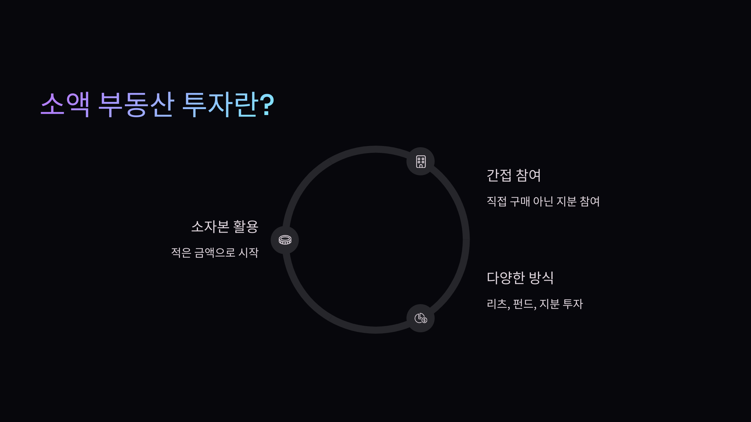 소액 부동산 투자는 말 그대로 소자본으로 부동산 관련 자산에 투자하는 방식입니다. 건물을 직접 사는 것이 아니라, 지분이나 리츠(REITs), 조합 펀드 등을 통해 간접 참여하는 형태죠.
