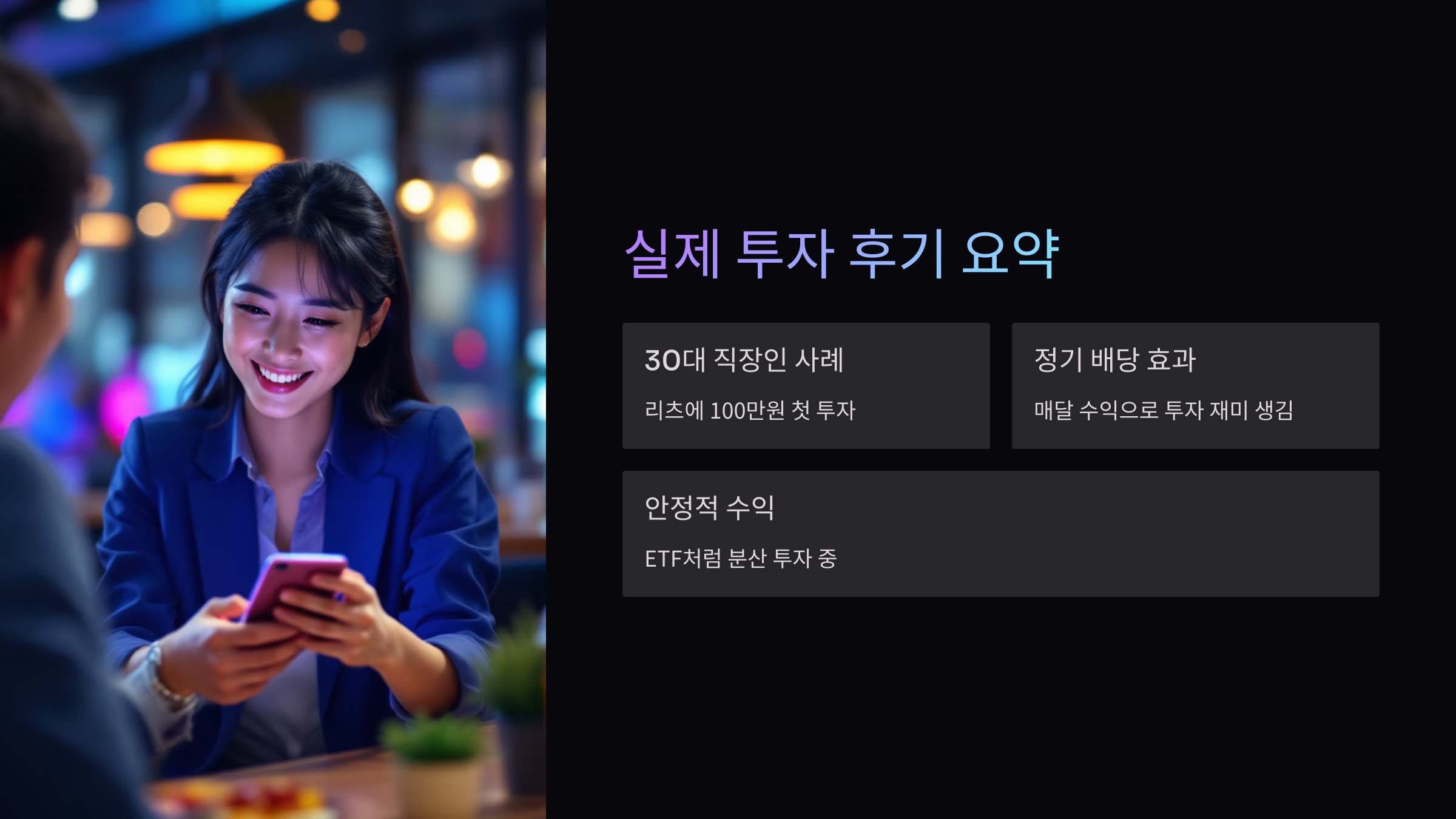 서울 거주 30대 직장인 A 씨: “처음으로 리츠에 100만 원 투자했는데, 매달 배당이 들어오니까 투자 재미가 생겼어요. 생각보다 안정적이어서 ETF처럼 분산 투자 중입니다.”