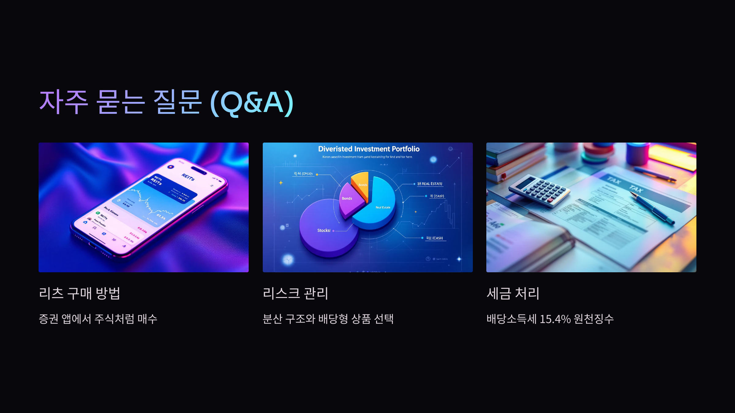 A. 배당소득세(15.4%)가 자동으로 원천징수됩니다. - Q. 외국 리츠도 소액으로 가능한가요?