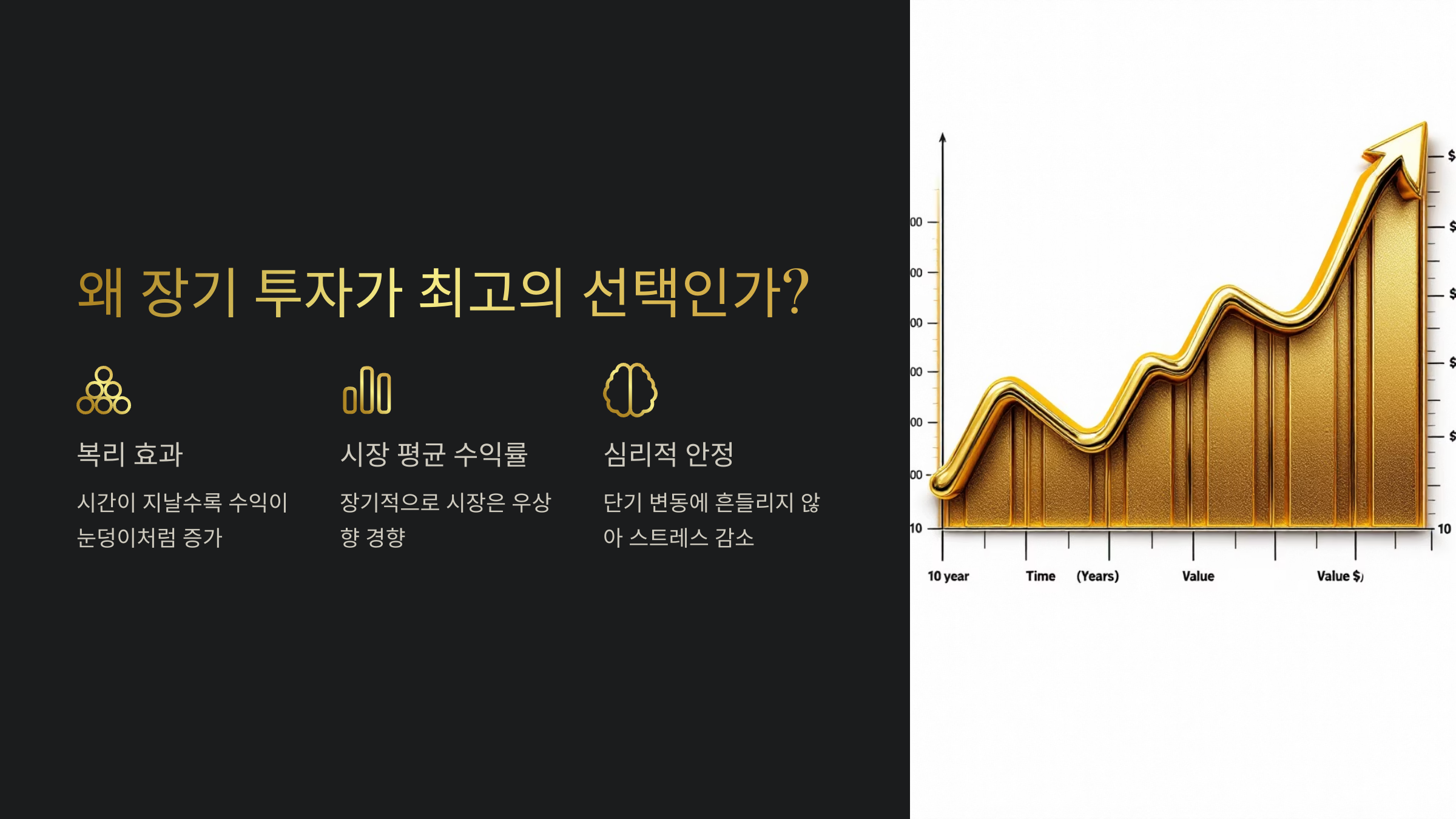 장기 투자는 최소 5년 이상 자산을 운용하는 투자 전략입니다. 짧은 기간의 시장 변동성에 일희일비하지 않고, 시간의 힘을 믿고 기다리는 방식이죠.