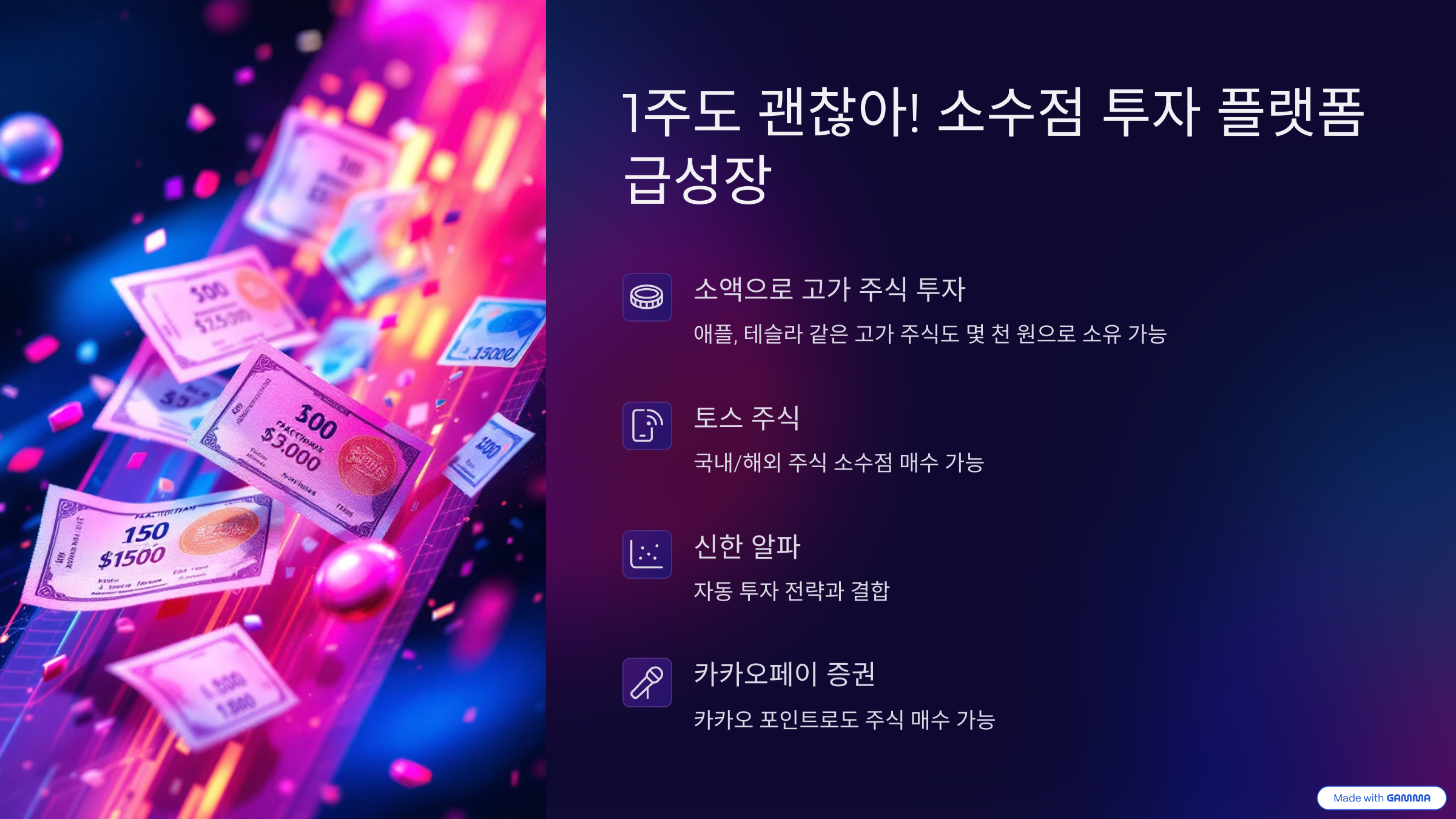 비싼 주식, 이제 한 주 안 사도 됩니다. '소수점 투자'가 가능한 플랫폼들이 등장하면서 애플, 테슬라 같은 고가 주식도 몇 천 원만으로 소유할 수 있게 되었어요. 저도 처음엔 "이게 되겠어?" 싶었는데, 지금은 거의 매주 소액 투자 중입니다.