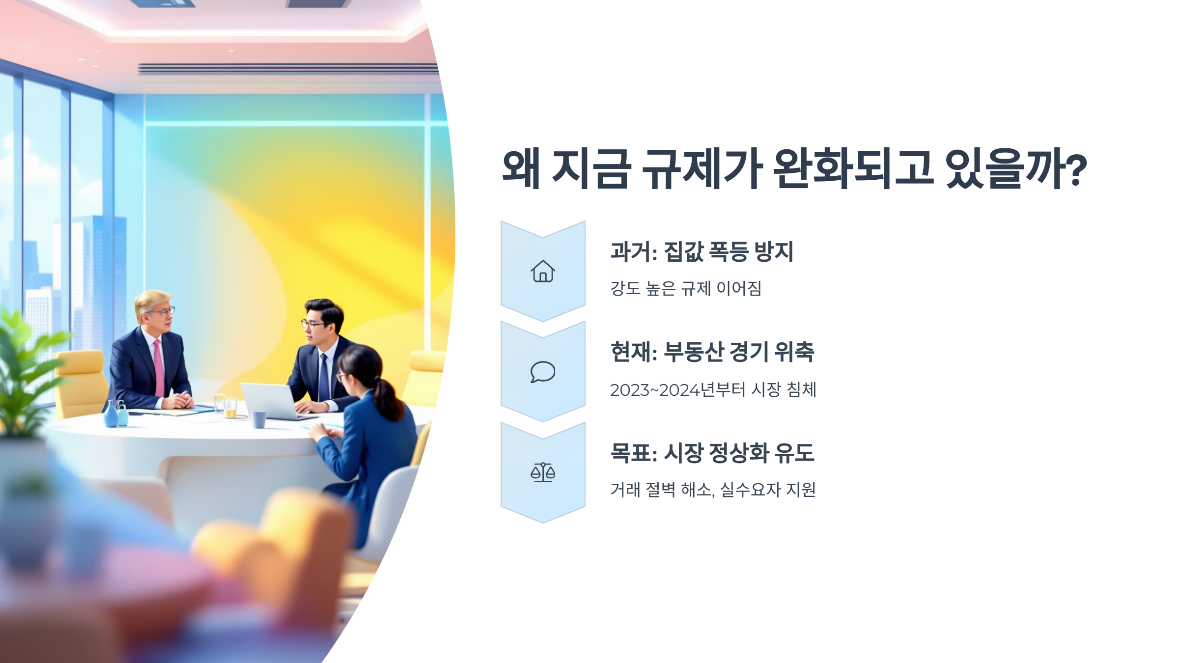 지난 몇 년간 집값 폭등과 과열을 막기 위한 강도 높은 규제가 이어졌습니다. 하지만 2023~2024년부터 부동산 경기가 위축되면서, 정부는 시장 정상화 유도를 위해 규제를 풀기 시작했죠.