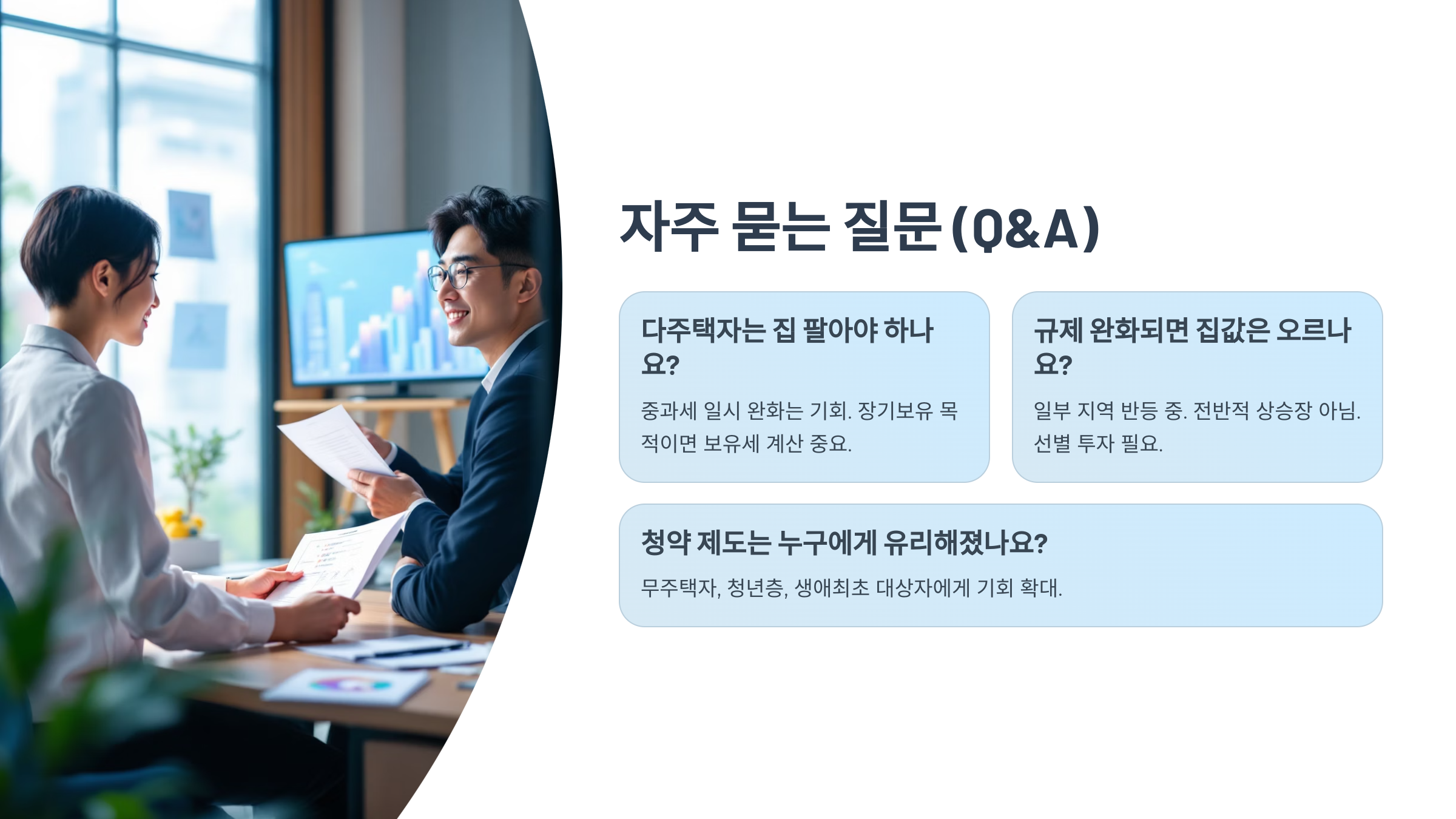 A. 중과세가 일시 완화된 지금은 기회일 수 있습니다. 장기보유 목적이라면 보유세 부담 계산이 중요합니다. - Q. 규제 완화되면 집값은 다시 오르나요?
