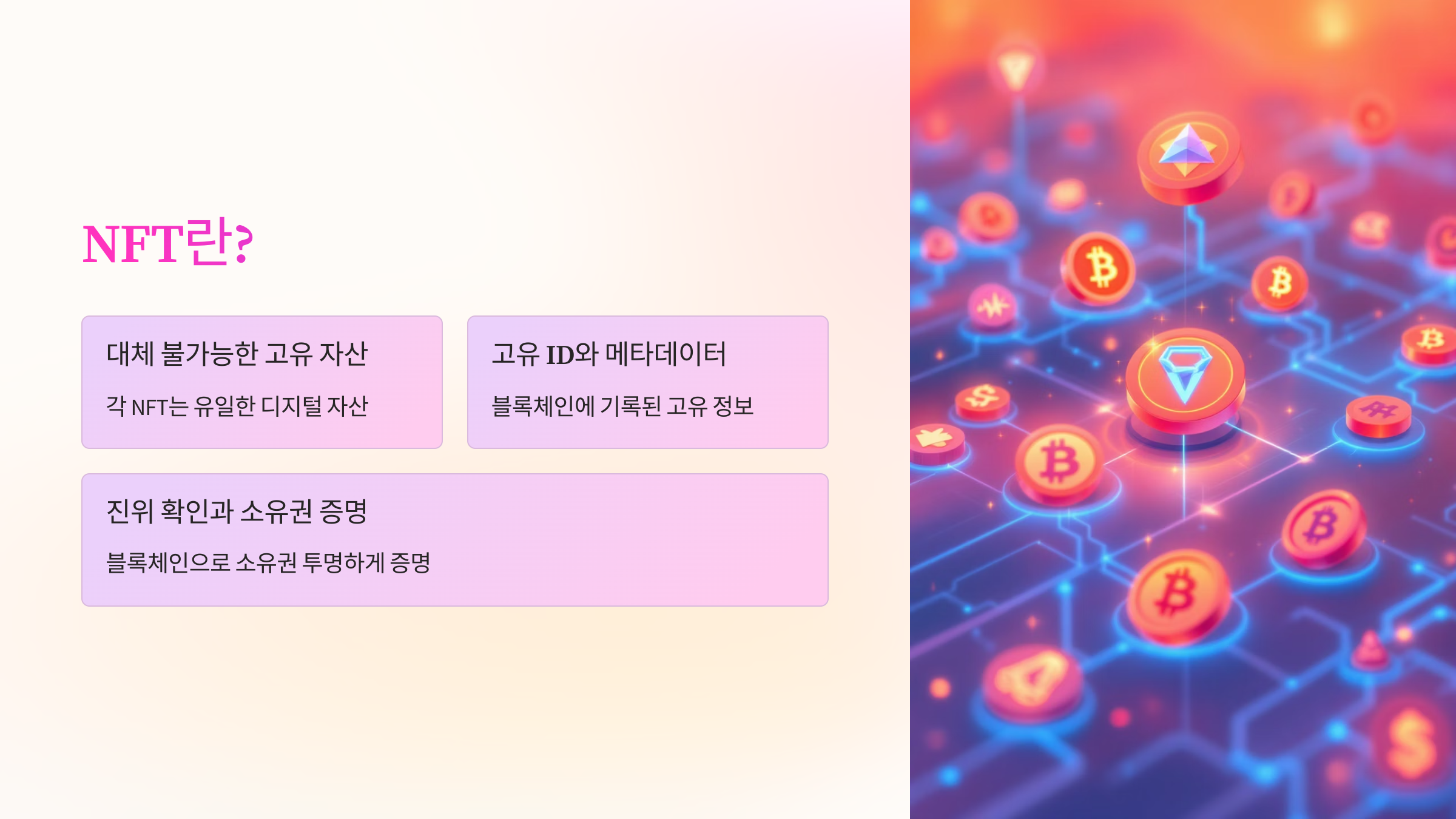 NFT(Non-Fungible Token)는 대체 불가능한 고유한 디지털 자산입니다. 각각의 NFT는 고유한 ID와 메타데이터를 가지며, 블록체인에 기록되어 진위 확인과 소유권 증명이 가능합니다.